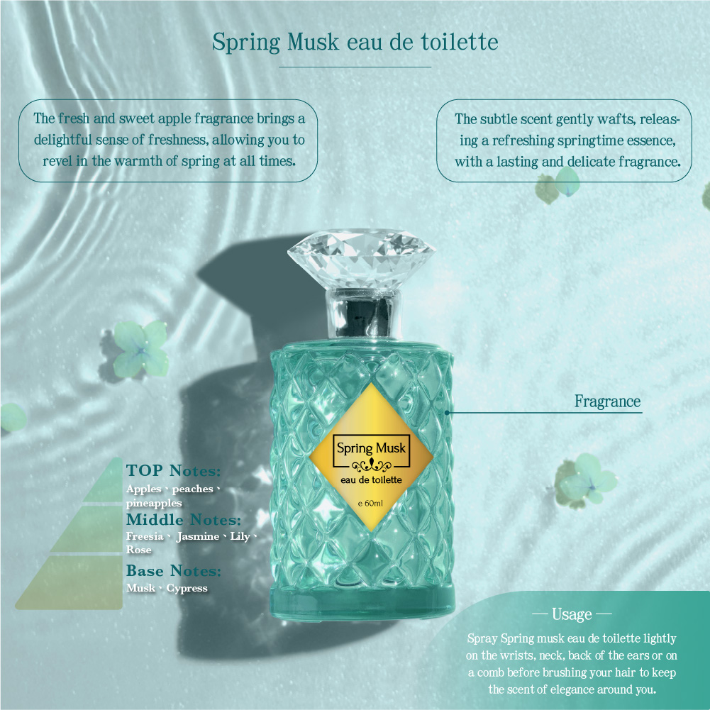 Spray Spring musk eau de toilette lightly on the wrists, neck, back of the ears or on a comb before brushing your hair to keep the scent of elegance around you.