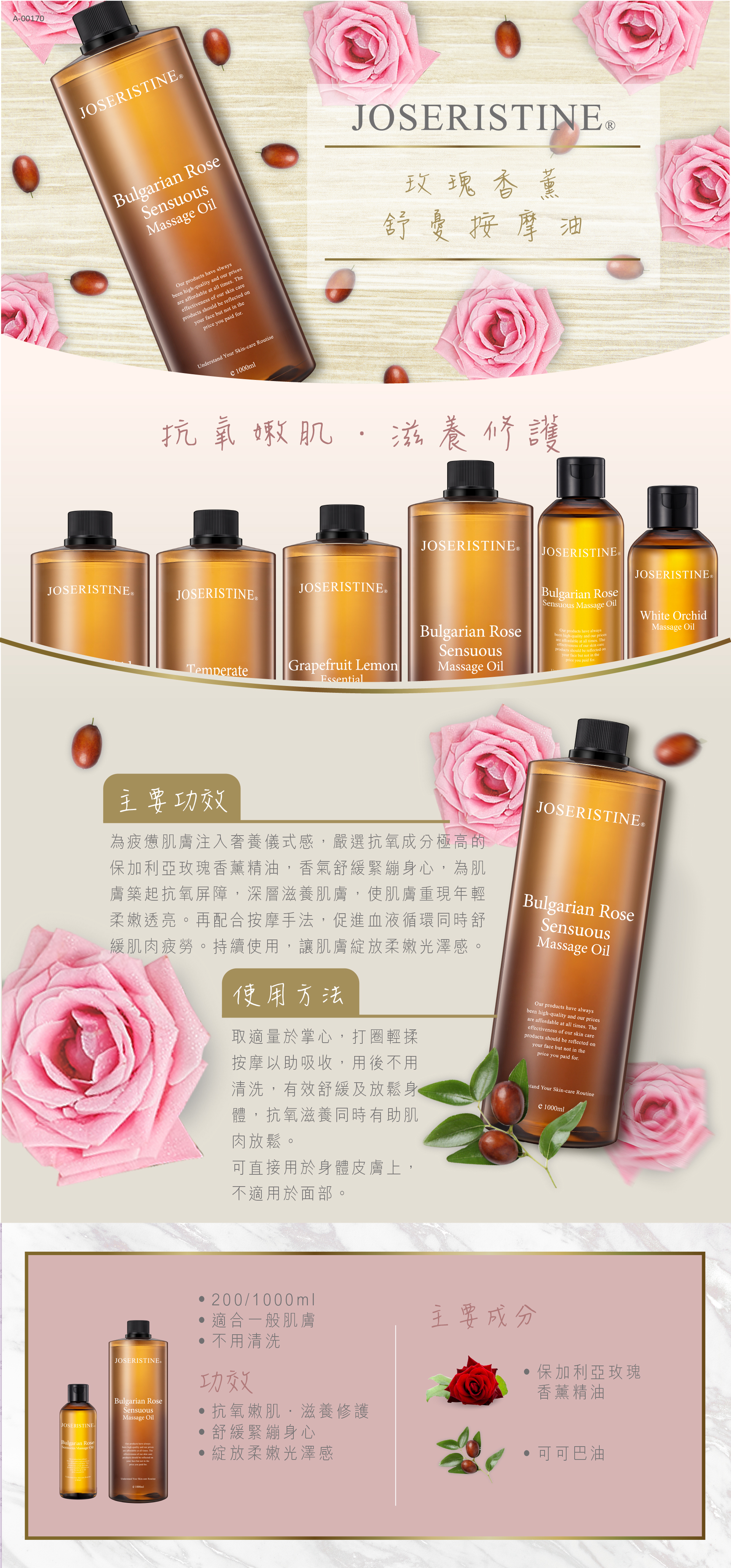 玫瑰香薰舒憂按摩油1000ml 1箱(12支)