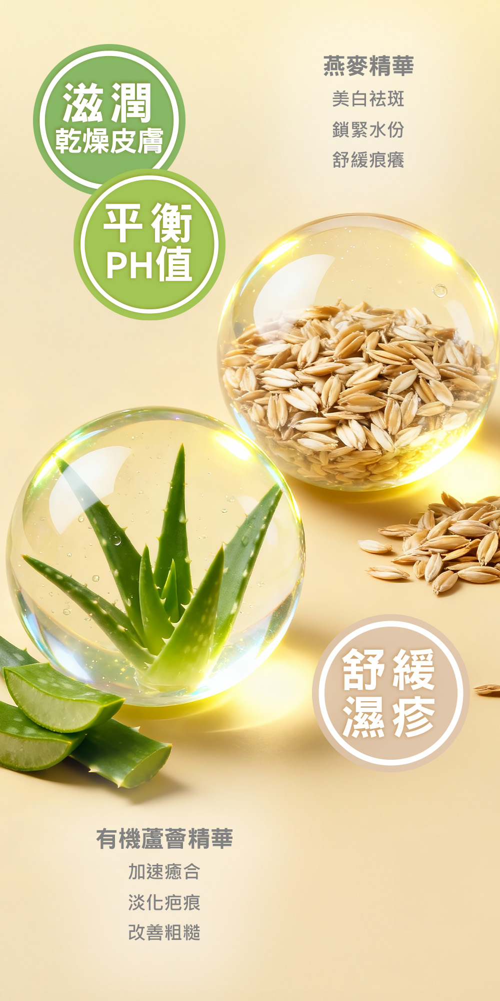 蘆薈精華、燕麥精華、乳木果、益生元、透明質酸、維他命E、維他命原B5