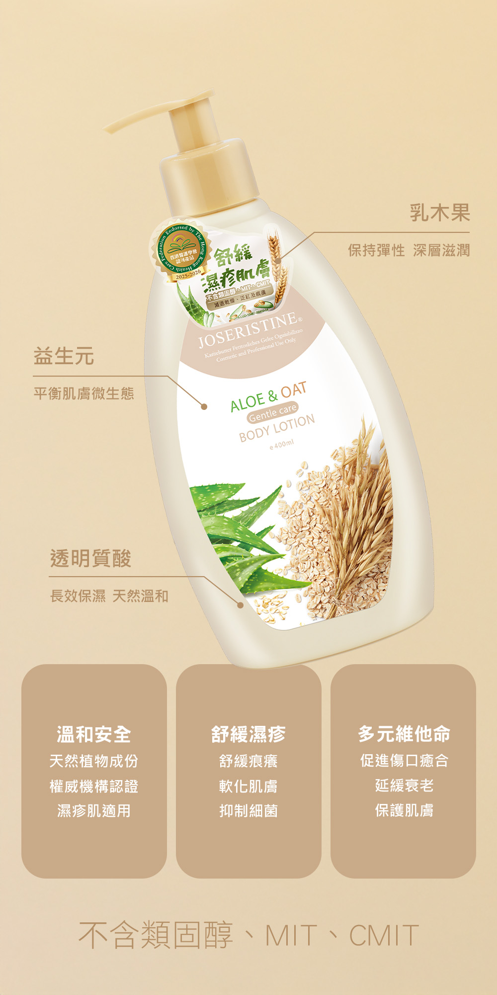 蘊含燕麥、蘆薈及乳木果等多種滋潤保濕成分,細膩潤滑的乳液於肌膚表面形成鎖水保護膜,給予肌膚深層長效的潤澤效果,可幫助舒緩及改善因乾燥引發肌膚痕癢、粗糙現象,呈現健康光彩。