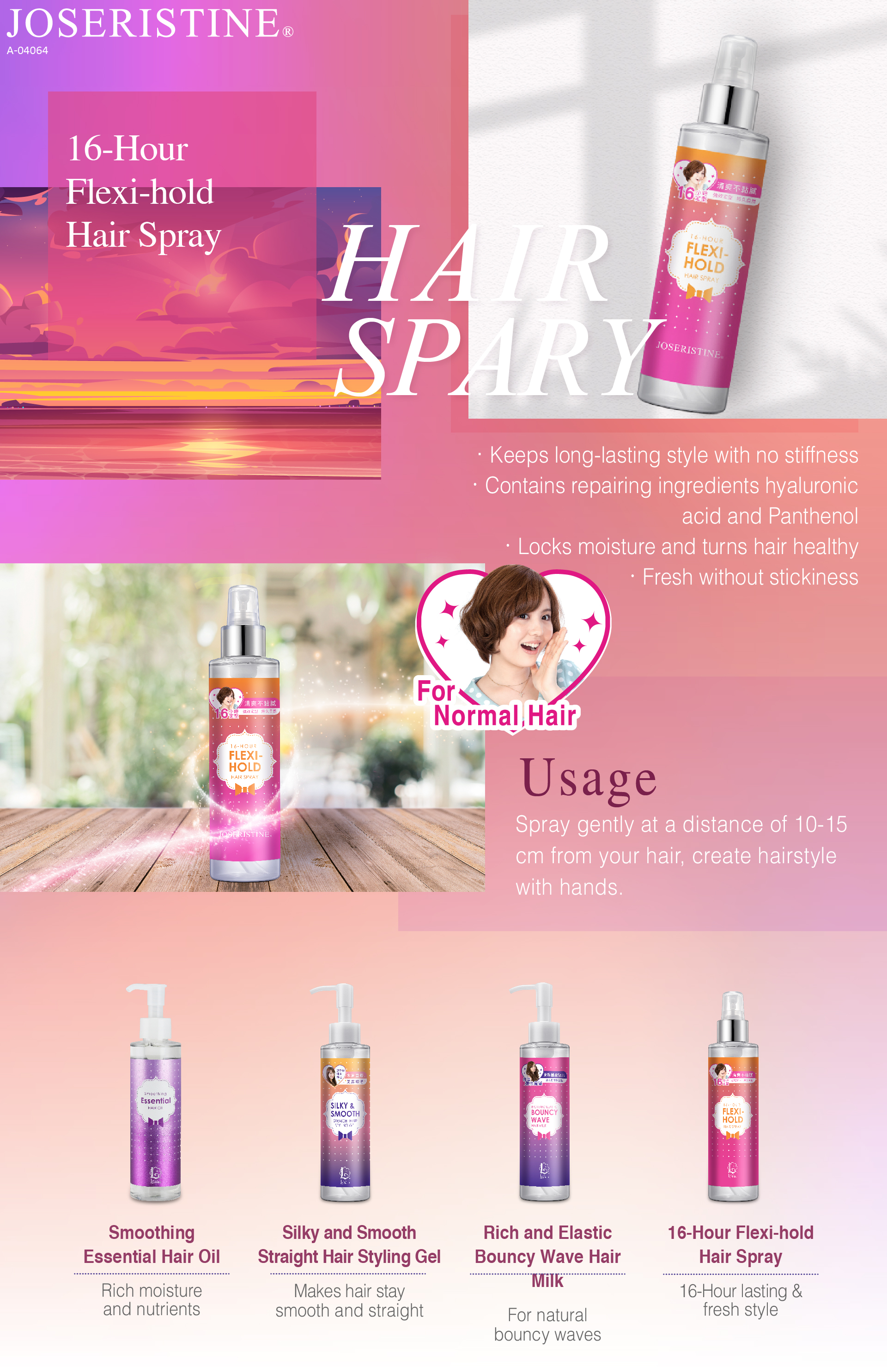 Spray gently at a distance of 10-15 cm from your hair, create hairstyle with hands.
