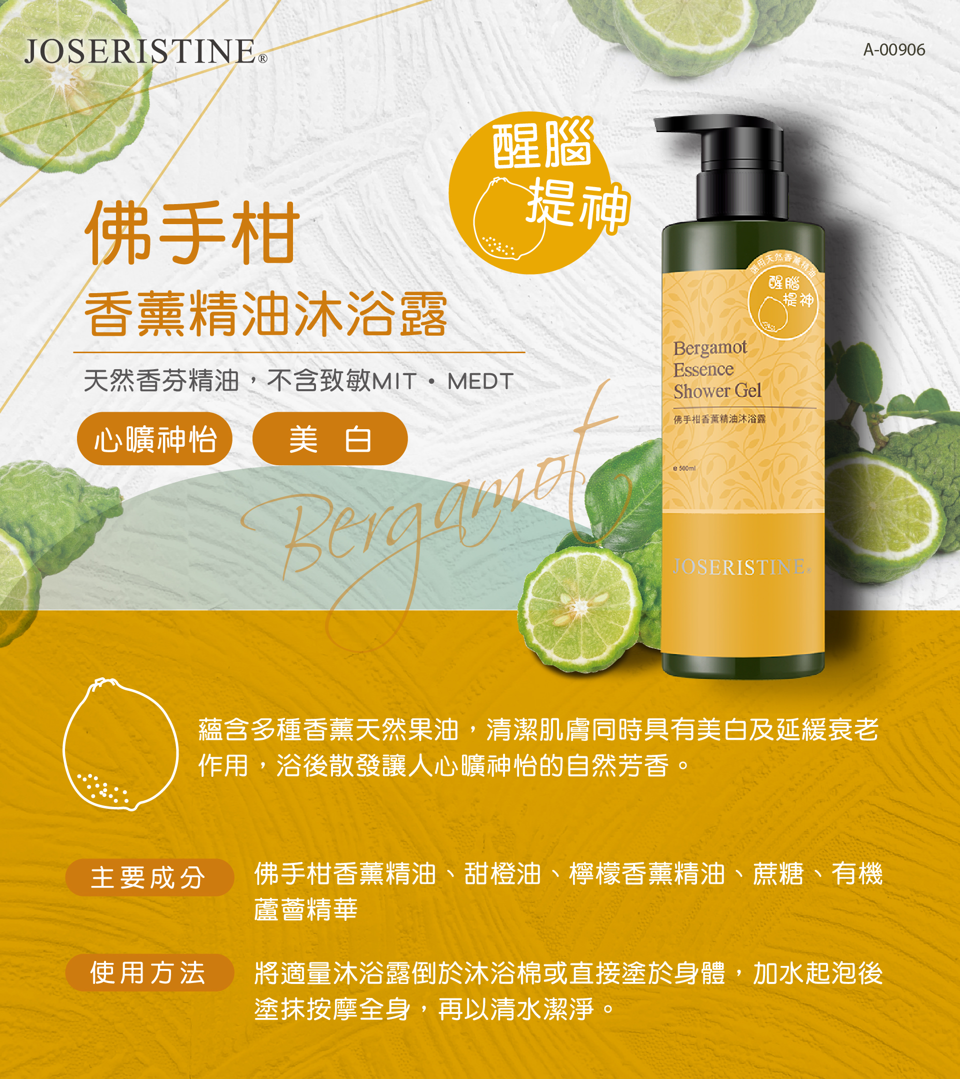 功效說明:蘊含多種香薰天然果油,清潔肌膚同時具有美白及延緩衰老作用,浴後散發讓人心曠神怡的自然芳香。
