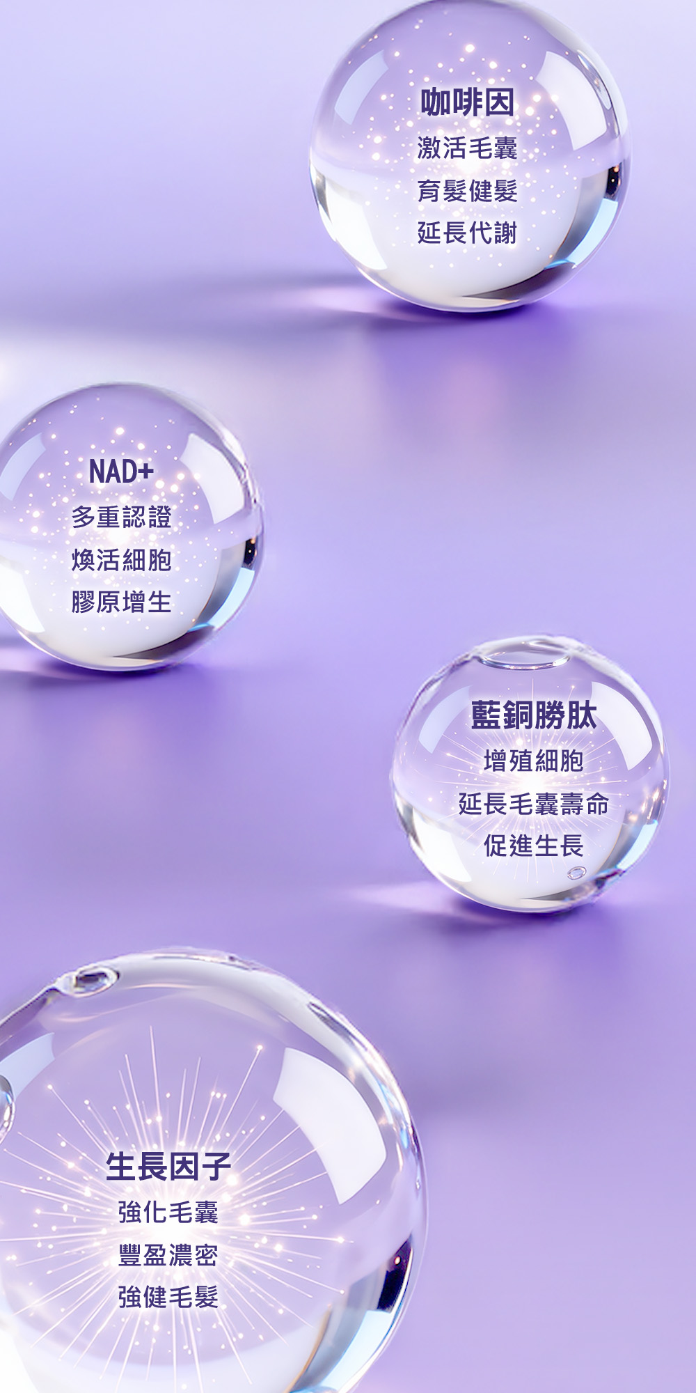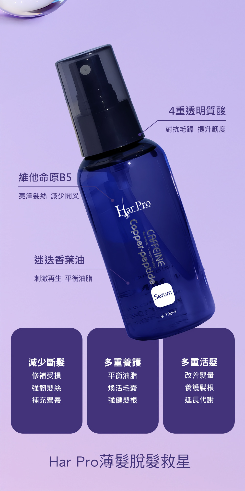 主要成分:NAD+、藍銅勝肽、咖啡因、生長因子、4重透明質酸、維他命原B5、迷迭香香薰精油