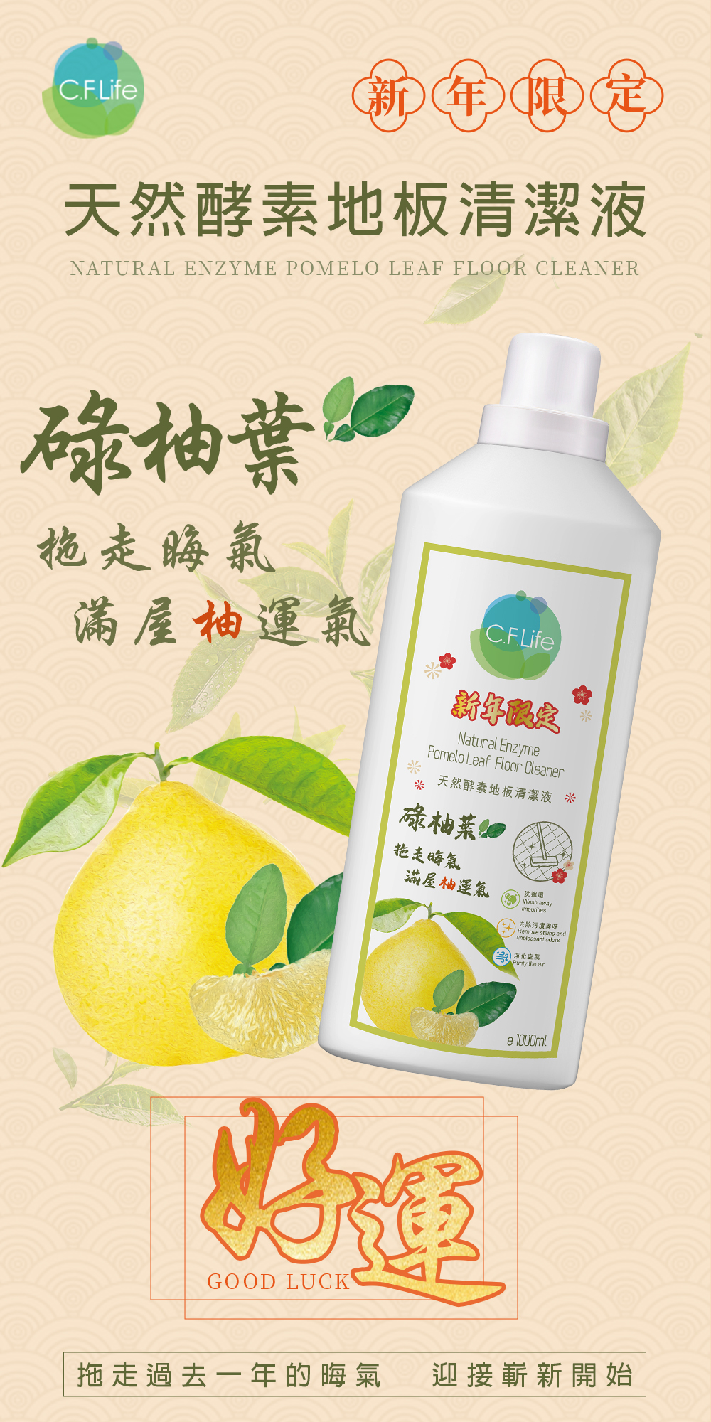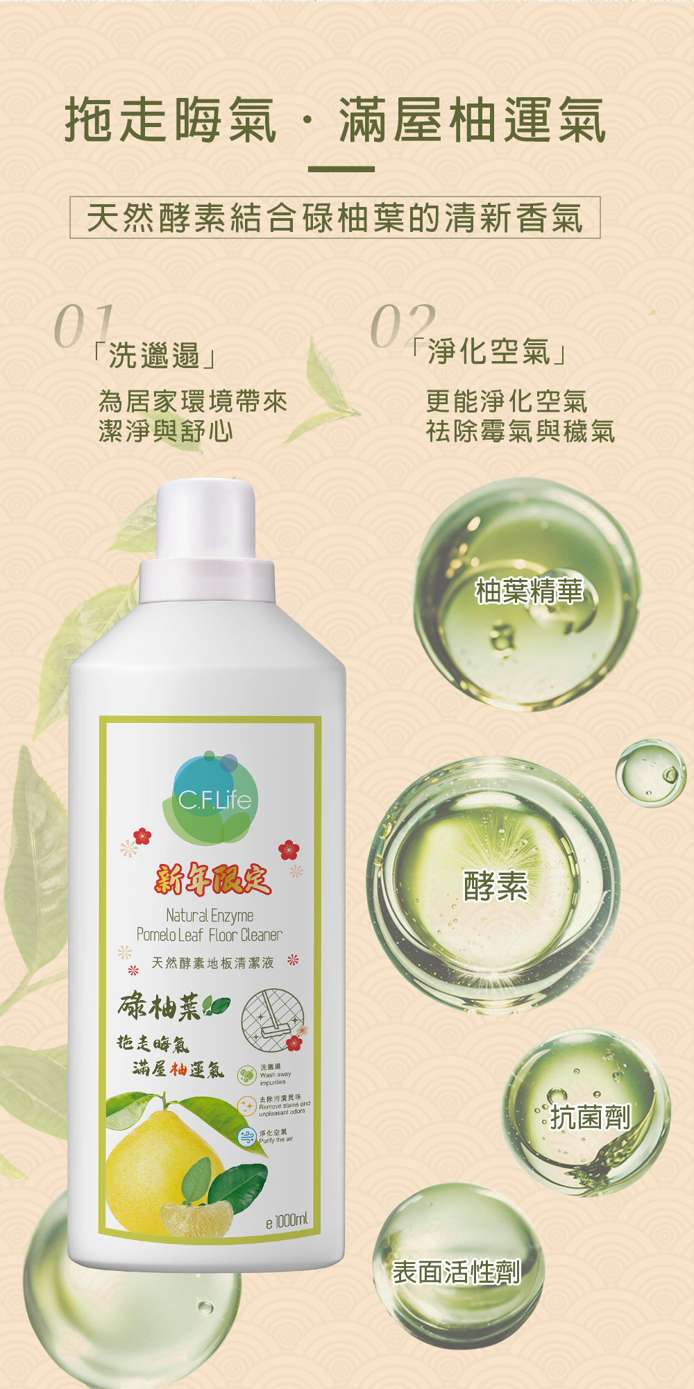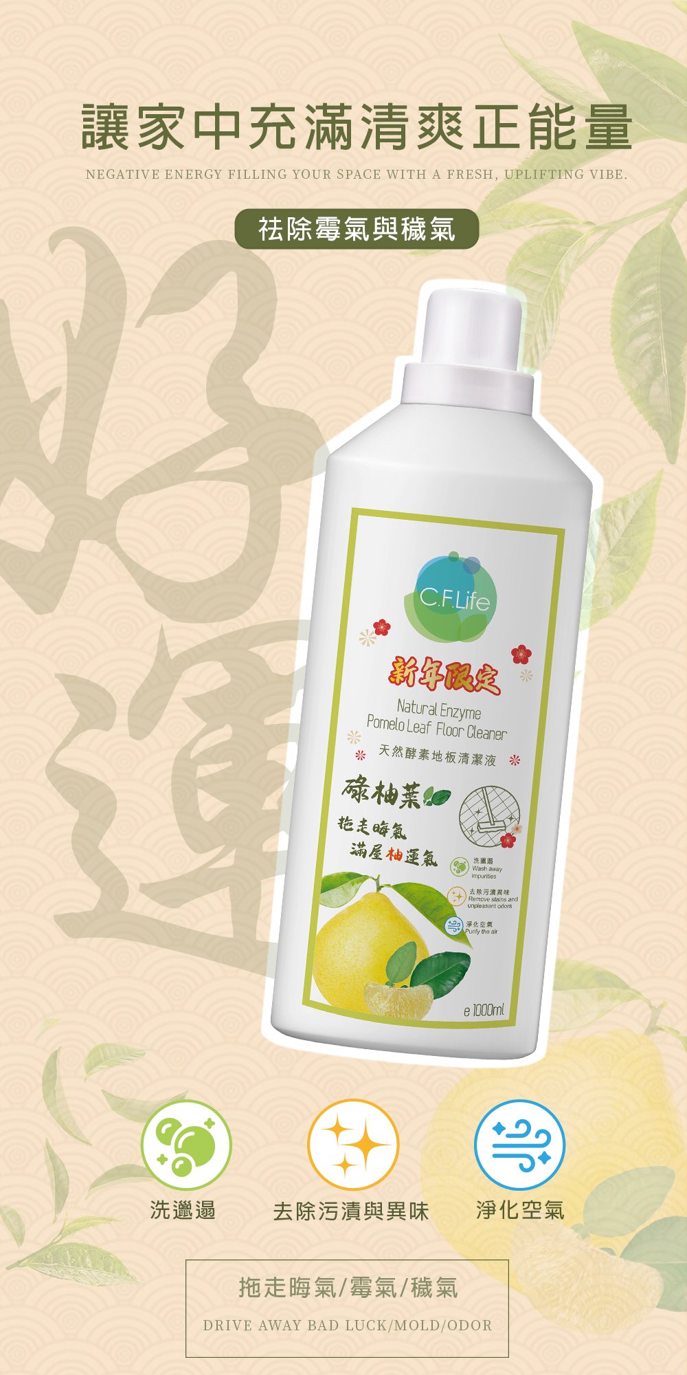 天然酵素結合碌柚葉的清新香氣,為居家環境帶來潔淨與舒心。能有效去除地板上的污漬與異味,更能淨化空氣,祛除霉氣與穢氣,讓家中充滿清爽正能量。拖走過去一年的晦氣,迎接嶄新開始。