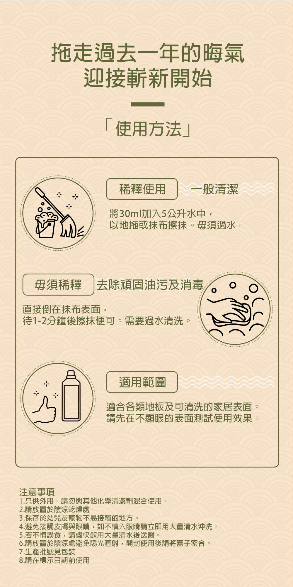 將30ml加入5公升水中,以地拖或抹布擦抹。毋須過水。