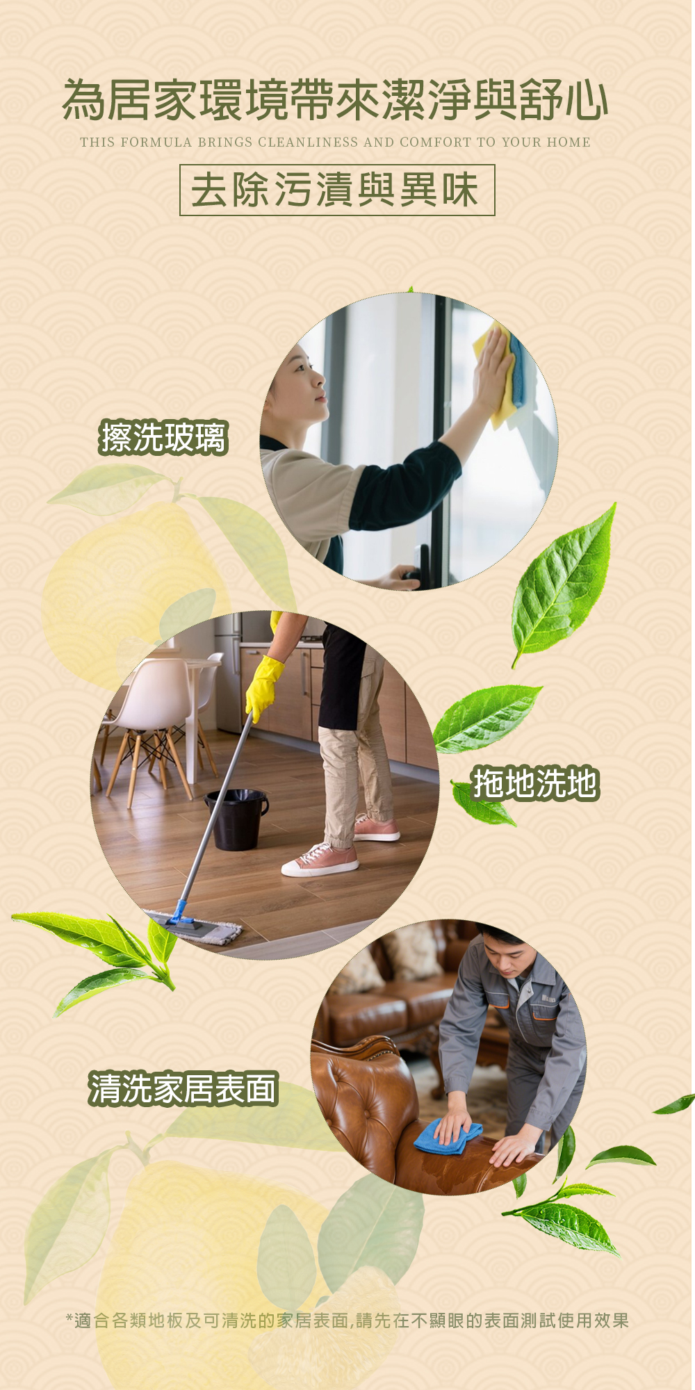 適合各類地板及可清洗的家居表面。請先在不顯眼的表面測試使用效果。