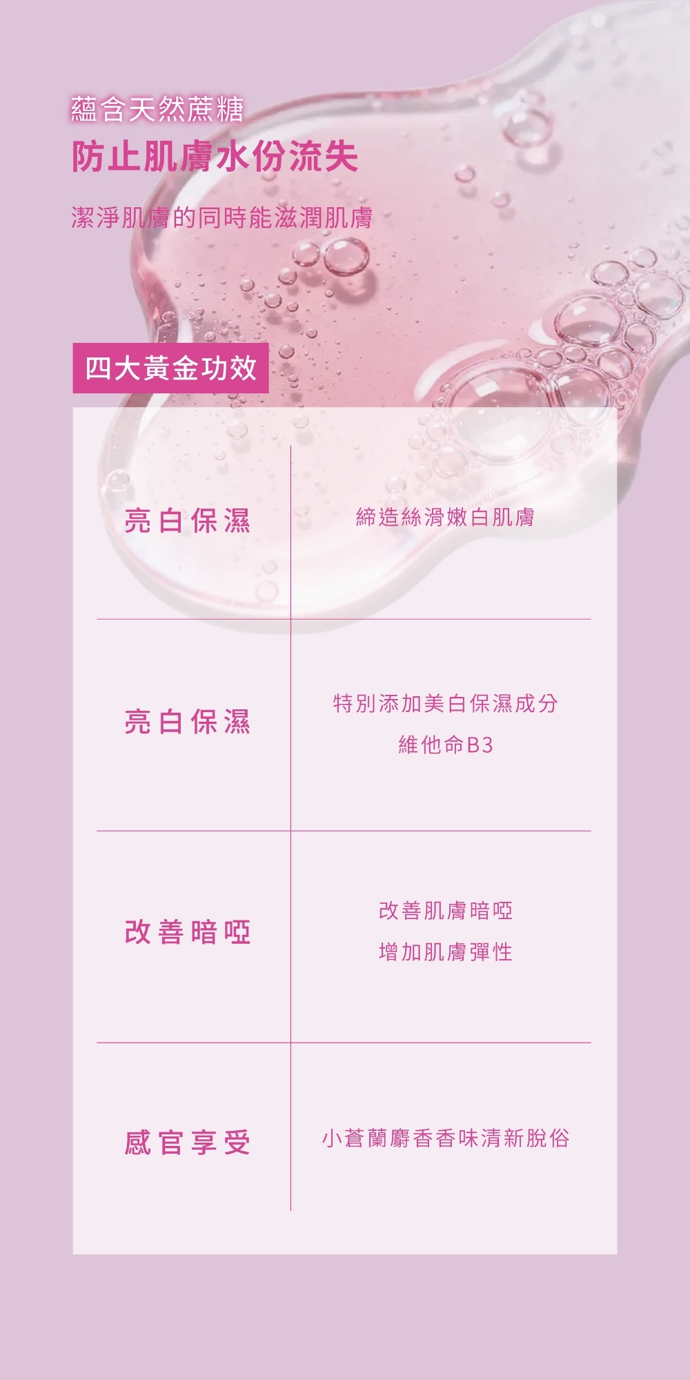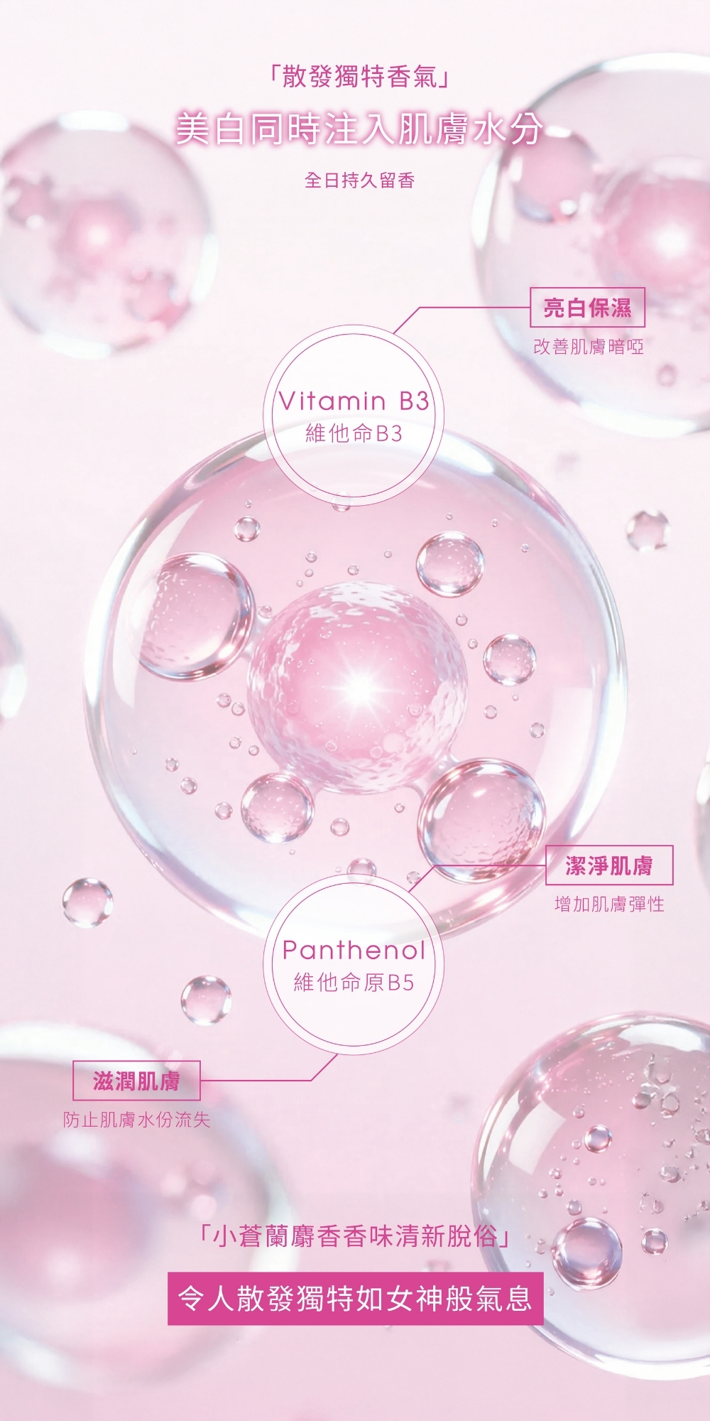 功效說明:.蘊含維他命B3及維他命原B5.美白同時注入肌膚水分.散發獨特如女神般粉紅麝香香氣 ,全日持久留香