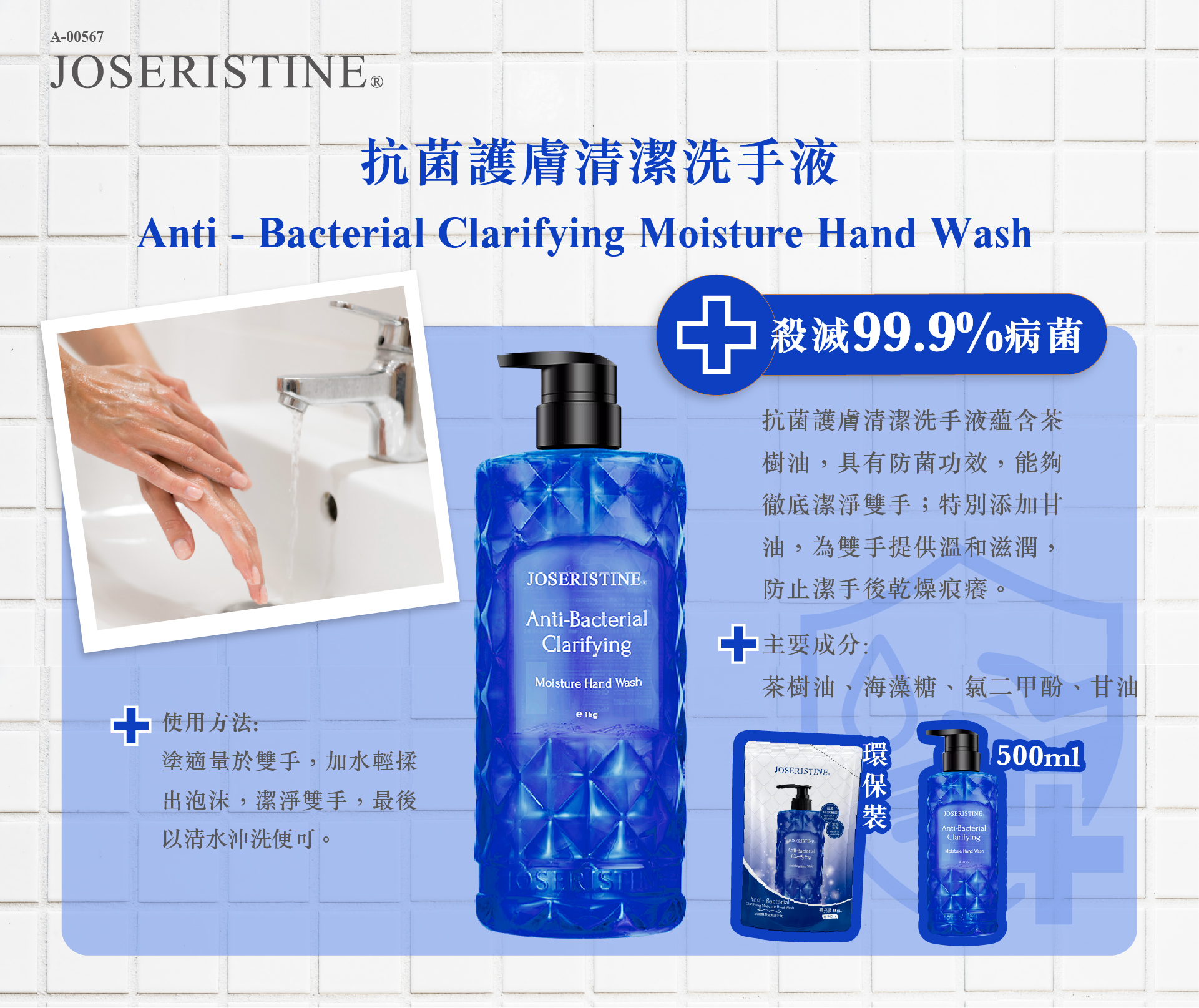 功效說明:抗菌護膚清潔洗手液蘊含茶樹油,具有防菌功效,能夠徹底潔淨雙手;特別添加甘油,為雙手提供溫和滋潤,防止潔手後乾燥痕癢。