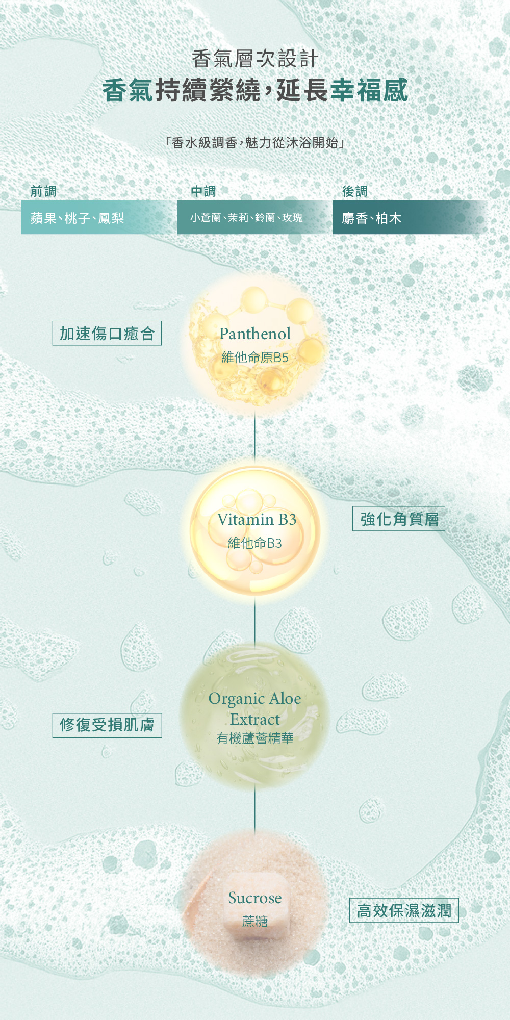 春日麝香沐浴露泡沫豐盈細膩,溫和潔淨身體,蘊含維他命B5、B3及天然蔗糖等多重保濕成分,於潔膚同時為肌膚補充水分。同時再加入有機蘆薈精華,有助修復肌膚天然屏障,舒緩肌膚乾燥痕癢。沐浴時散發清甜的蘋果花清香,浴後盈潤有光澤。