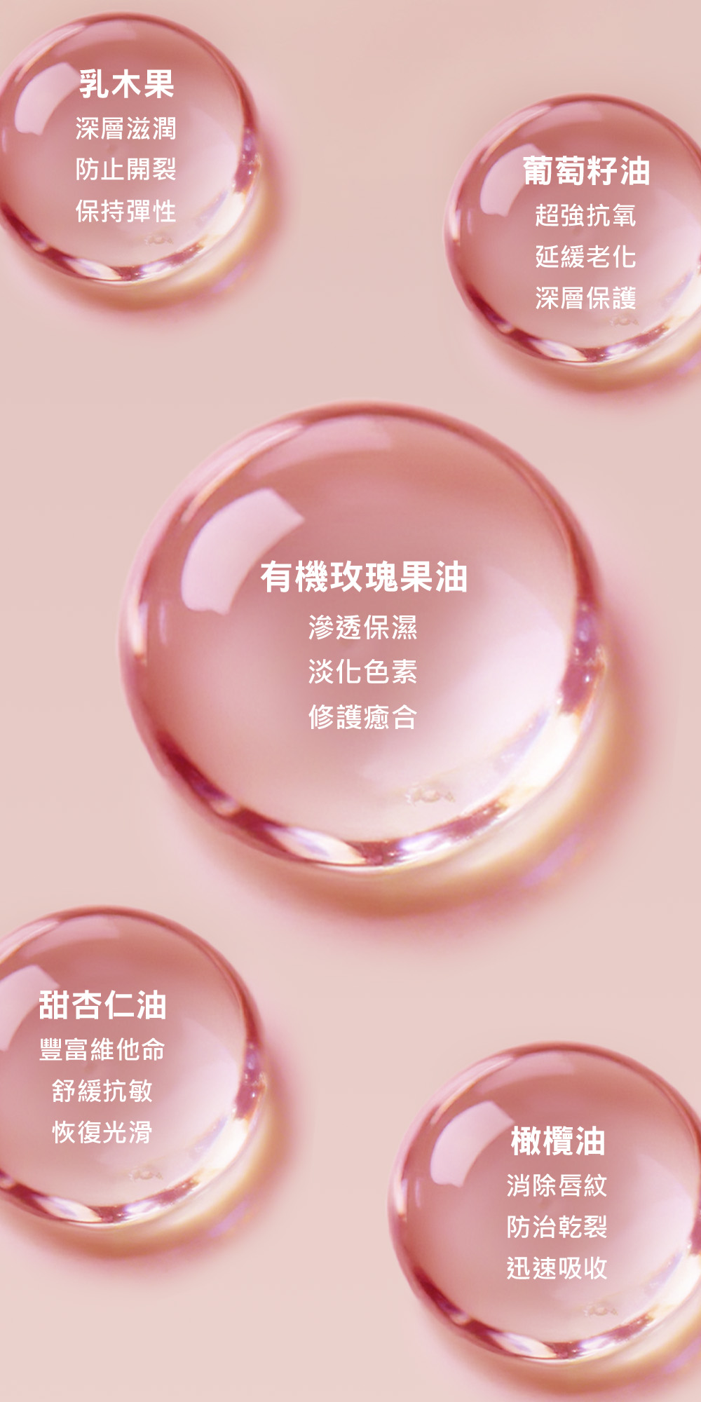 主要成分:有機玫瑰果油、植物甾醇、有機摩洛哥純堅果油、乳木果、葡萄籽油、甜杏仁油、可可巴油、橄欖油、維他命E