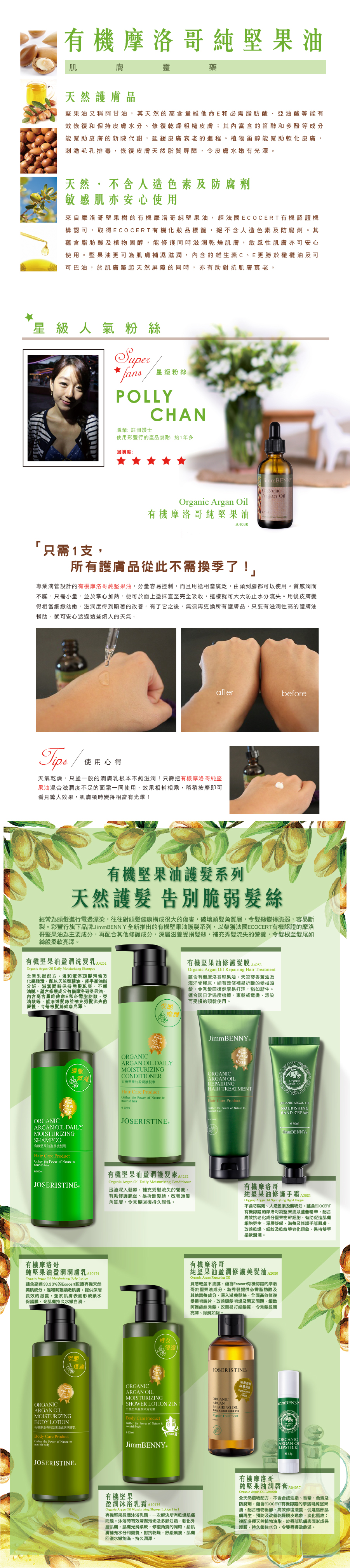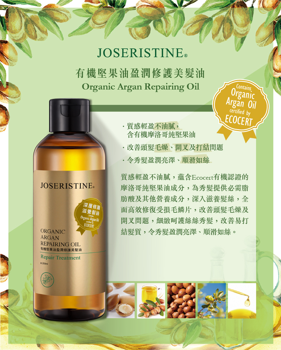 功效說明:質感輕盈不油膩,蘊含Ecocert有機認證的摩洛哥純堅果油成分,為秀髮提供必需脂肪酸及其他營養成分,深入滋養髮絲,全面高效修復受損毛鱗片,改善頭髮毛燥及開叉問題,細緻呵護絲絲秀髮,改善易打結髮質,令秀髮盈潤亮澤、順滑如絲。