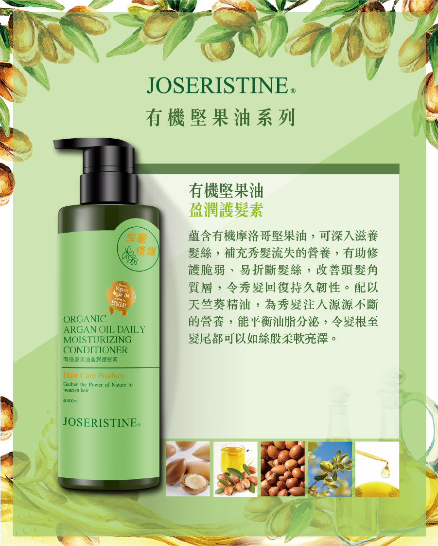 功效說明:蘊含有機摩洛哥堅果油,可深入滋養髮絲,補充秀髮流失的營養,有助修護脆弱、易折斷髮絲,改善頭髮角質層,令秀髮回復持久韌性。配以天竺葵精油,為秀髮注入源源不斷的營養,能平衡油脂分泌,令髮根至髮尾都可以如絲般柔軟亮澤。