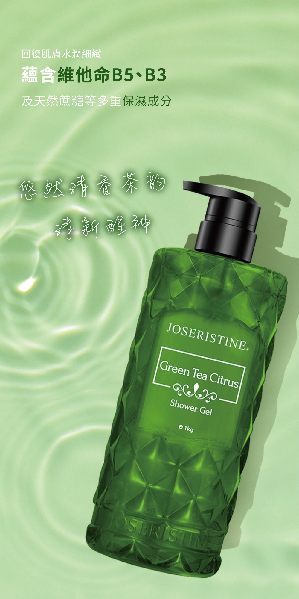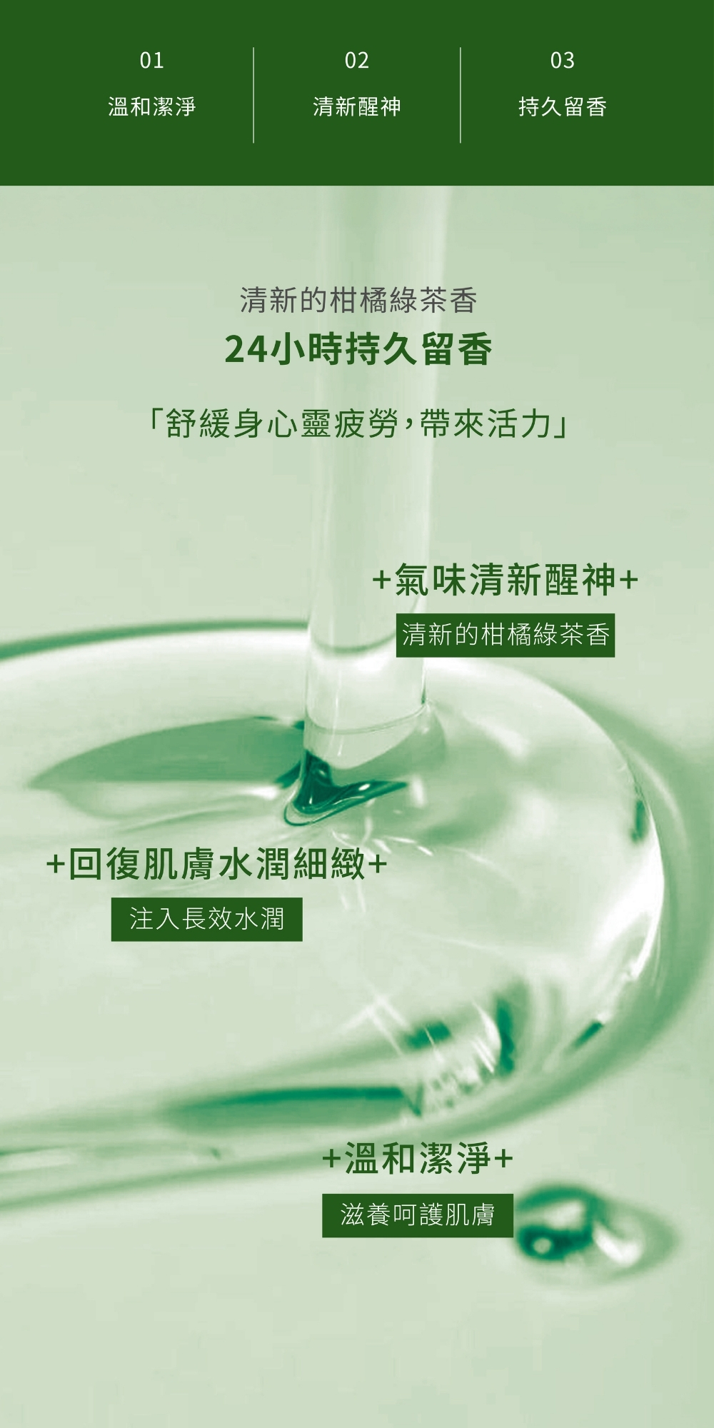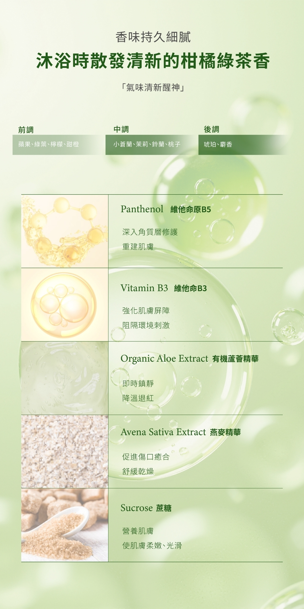 蘊含維他命B5、B3及天然蔗糖等多重保濕成分,溫和潔淨同時滋養呵護肌膚,回復肌膚水潤細緻。沐浴時散發清新的柑橘綠茶香,氣味清新醒神,舒緩身心靈疲勞,帶來活力。
