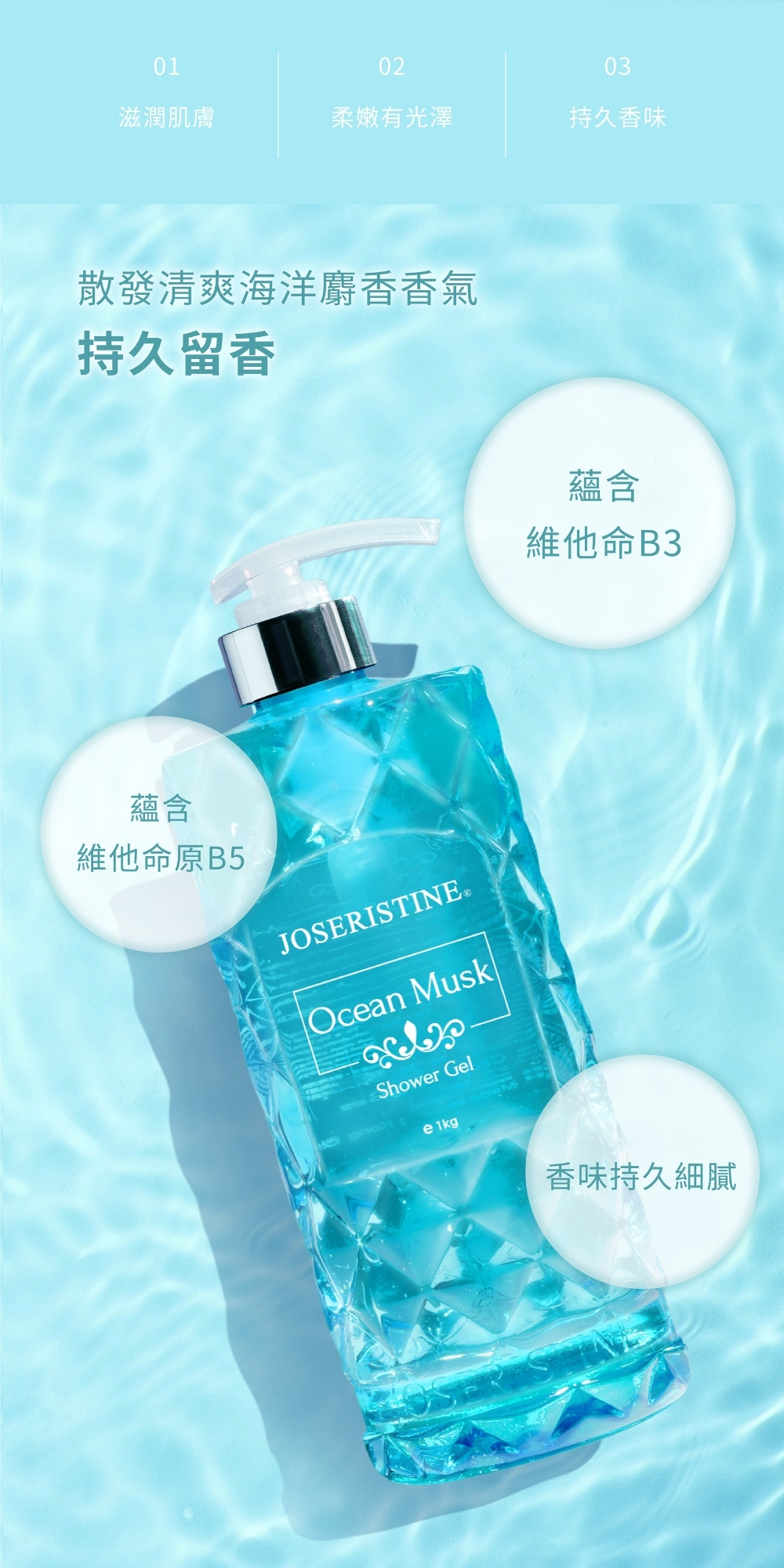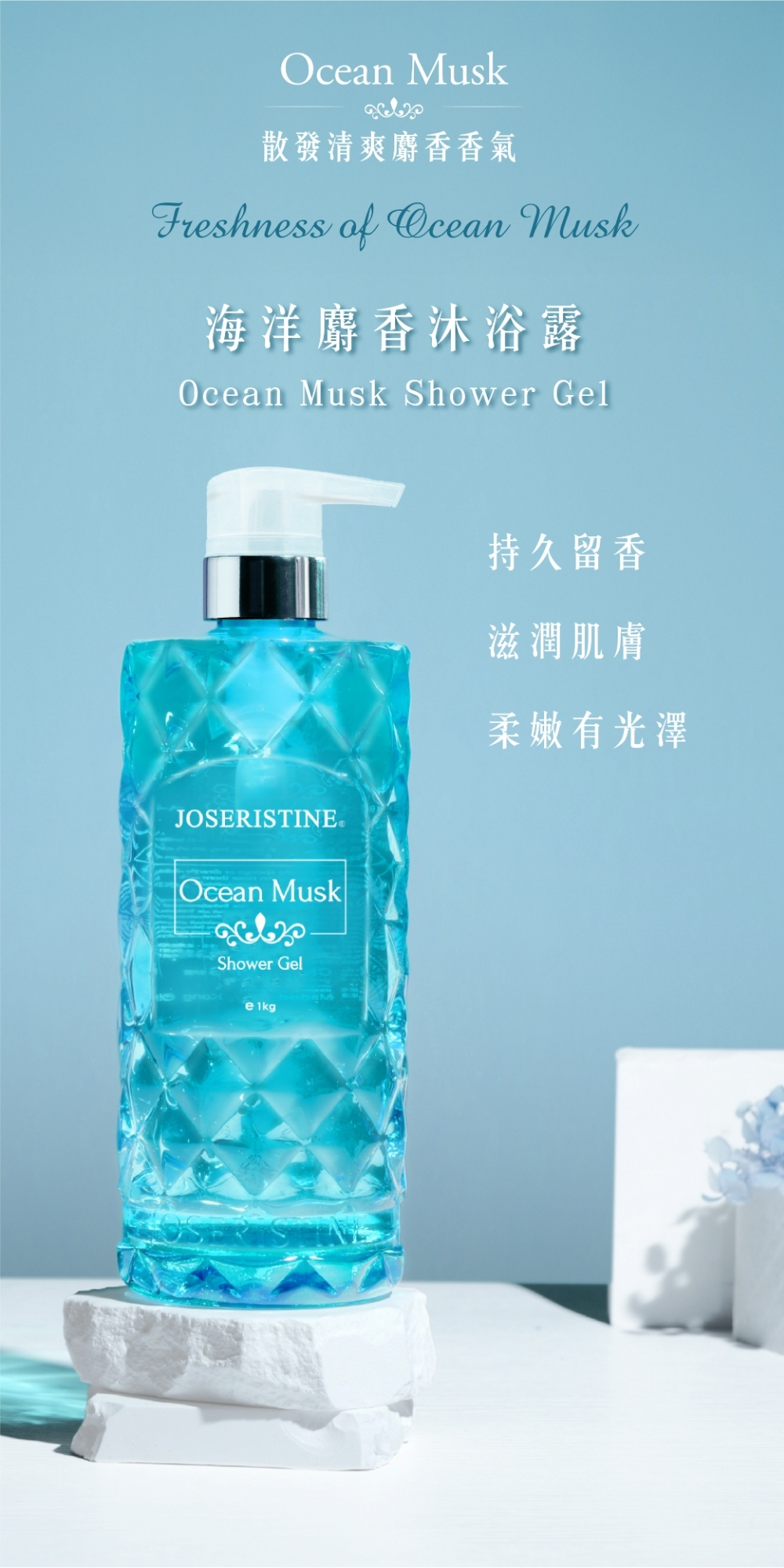 海洋麝香沐浴露蘊含天然蔗糖、有機蘆薈精華及維他命原B5成分,潔淨肌膚的同時能滋潤肌膚,防止肌膚水份流失。另特別添加海藻糖,使肌膚更柔嫩有光澤。海洋麝香香味活潑舒服,令人散發清爽活力的海洋氣息