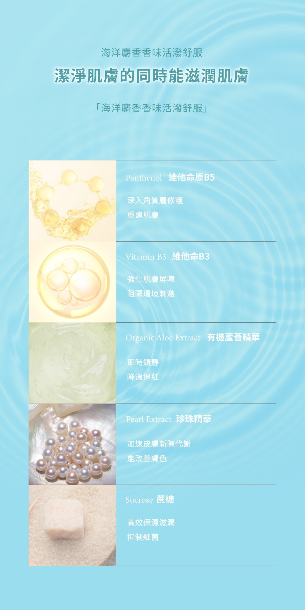 維他命B3、維他命原B5、珍珠精華、有機蘆薈精華、海藻糖、蔗糖