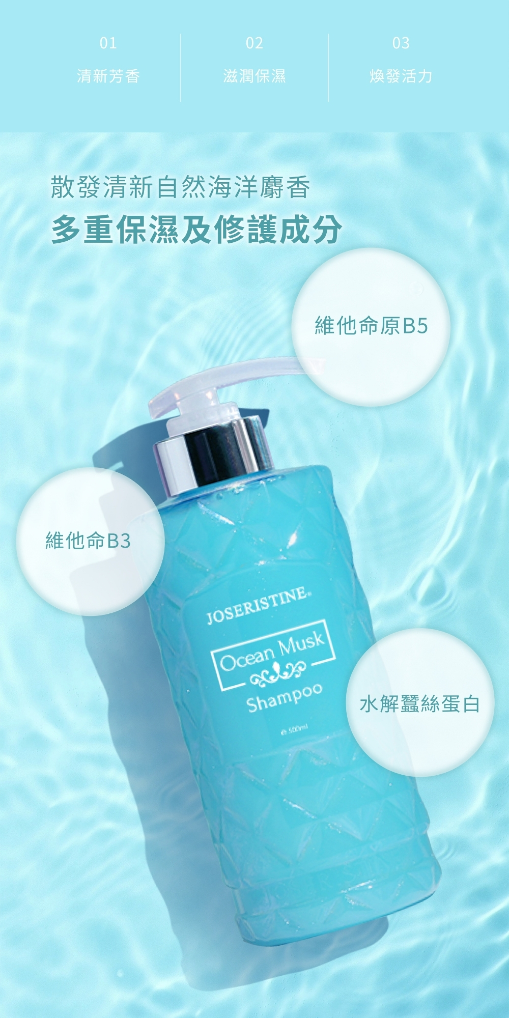 泡沫細膩綿密,能洗淨毛囊垃圾及殘留的有害物質。特別添加海甘藍籽油、水解蠶絲蛋白等滋潤成分,平衡頭皮油脂分泌同時能為髮絲提供多重保濕及修護,使秀髮煥發活力,增添光澤。再配合海洋麝香的清新自然香味,使人時刻神采飛揚倍添活力。