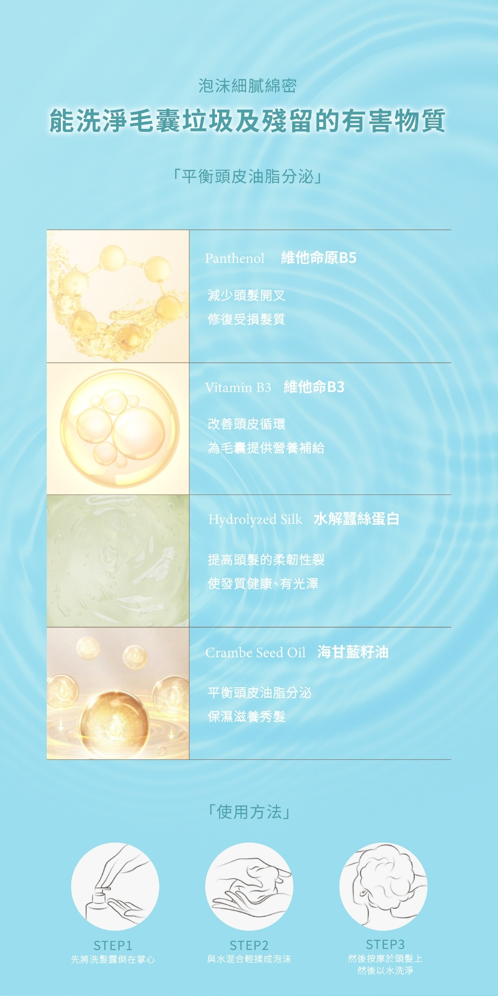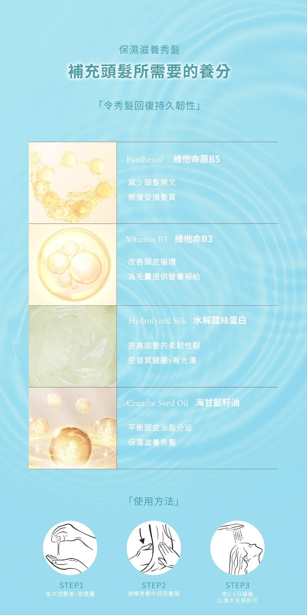 海甘藍籽油、水解蠶絲蛋白、維他命原B5、維他命B3