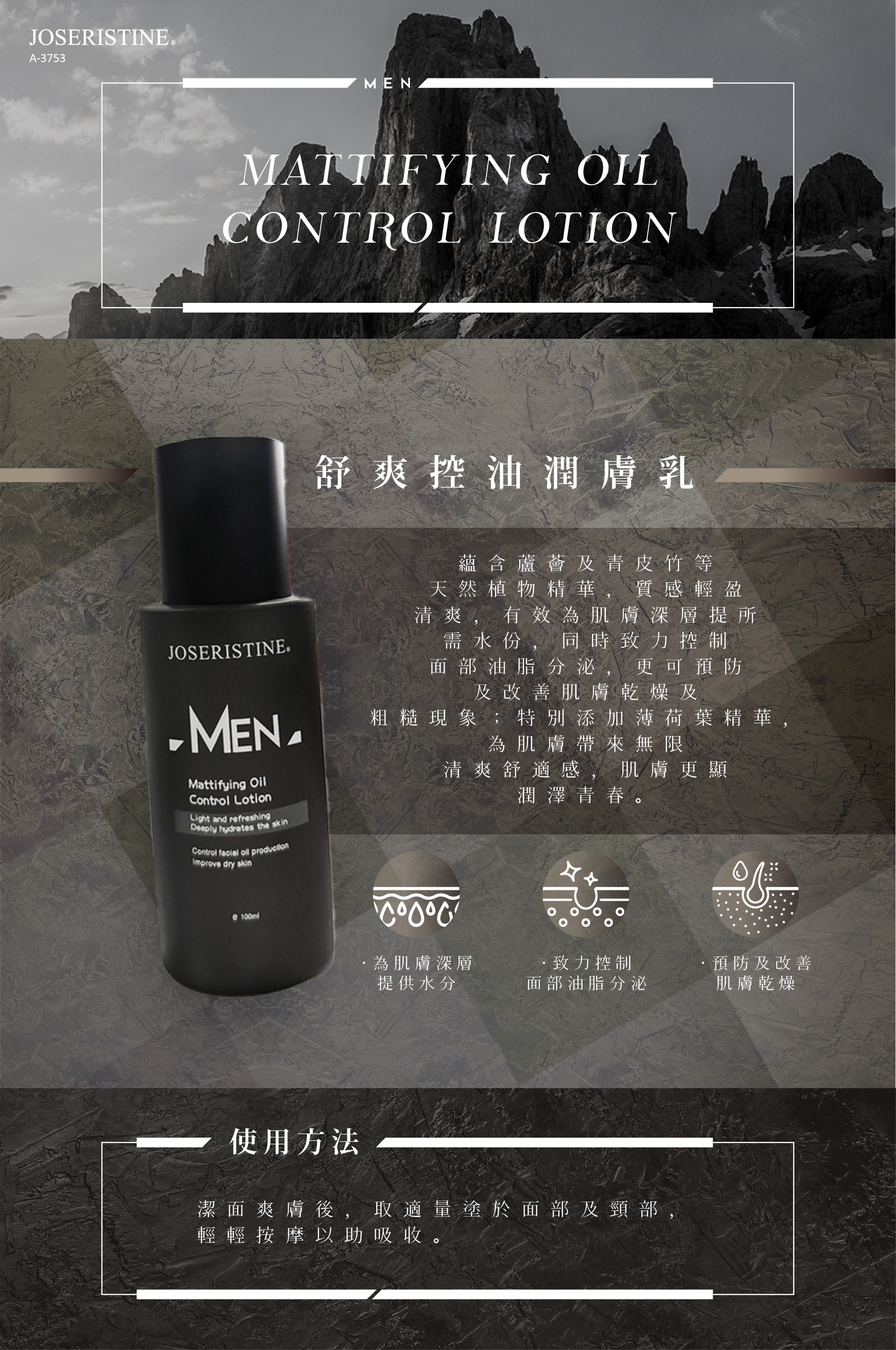 蘊含蘆薈及青皮竹等天然植物精華,質感輕盈清爽,有效為肌膚深層提供所需水份,同時致力控制面部油脂分泌,更可預防及改善肌膚乾燥及粗糙現象;特別添加薄荷葉精華,為肌膚帶來無限清爽舒適感,肌膚更顯潤澤青春。