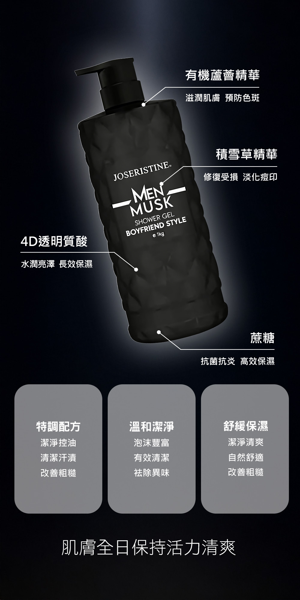 專為男士調配的潔淨控油配方,令肌膚全日保持活力清爽,同時蘊含4重透明質酸、有機蘆薈及積雪草精華,潔淨肌膚同時呵護肌膚,持久鎖緊肌膚水分。再配合獨特的香味,沐浴後芳香四逸,彰顯風度翩翩的非凡魅力,散發男士性感魅力。