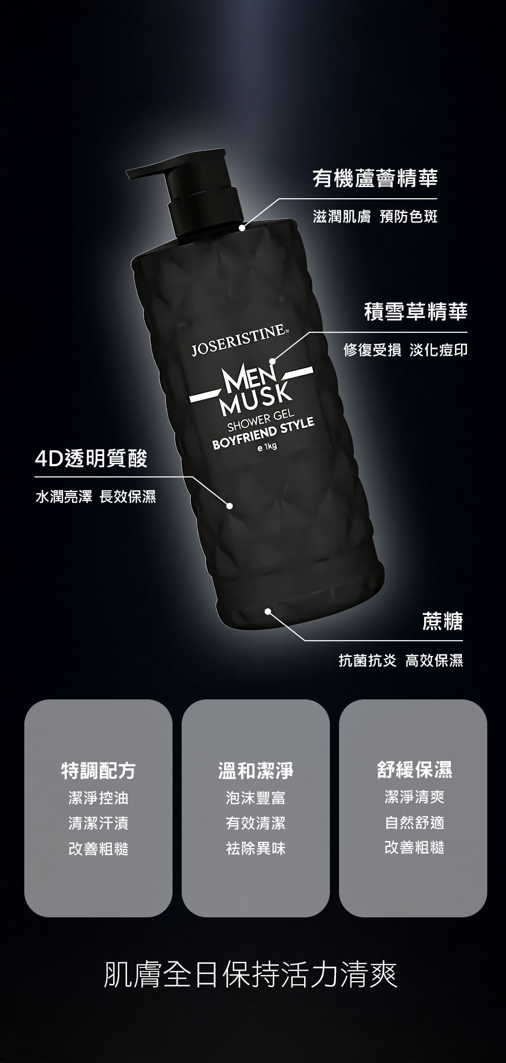 專為男士調配的潔淨控油配方,令肌膚全日保持活力清爽,同時蘊含4重透明質酸、有機蘆薈及積雪草精華,潔淨肌膚同時呵護肌膚,持久鎖緊肌膚水分。再配合獨特的香味,沐浴後芳香四逸,彰顯風度翩翩的非凡魅力,散發男士性感魅力。