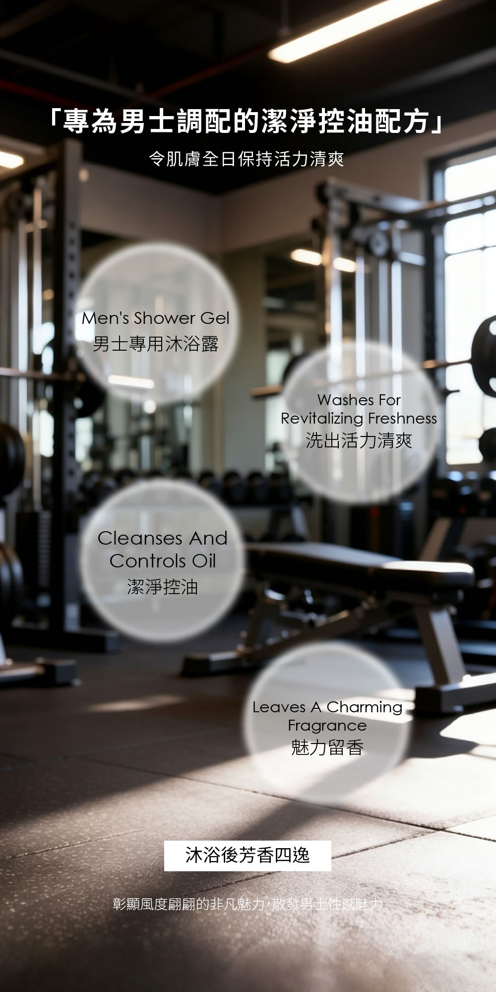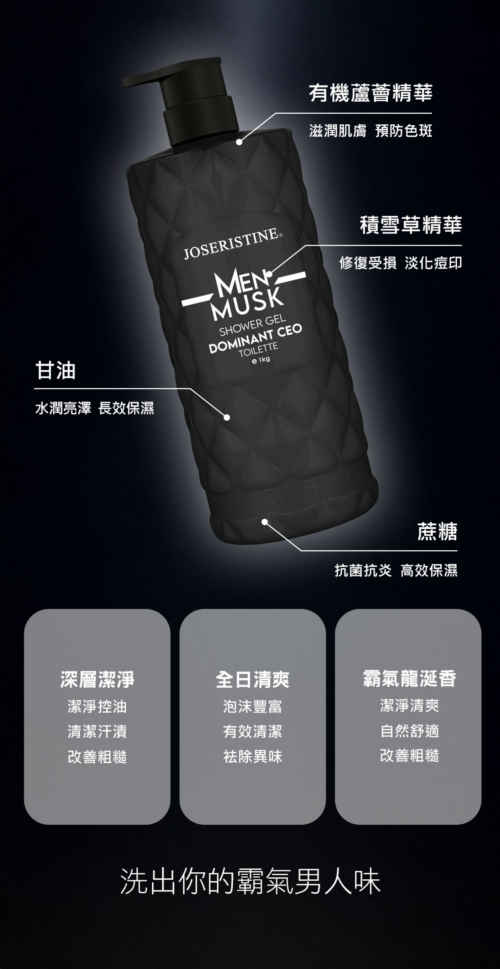 專為男士調配的潔淨控油配方,針對男性容易出現的汗水、油脂等問題,全方位深層潔淨肌膚,保持全日乾淨清爽。龍涎香搭配麝香獨特的香氣,沐浴後芳香四逸,讓你展現自信與魅力,頃刻之間釋放霸道總裁的氣場。