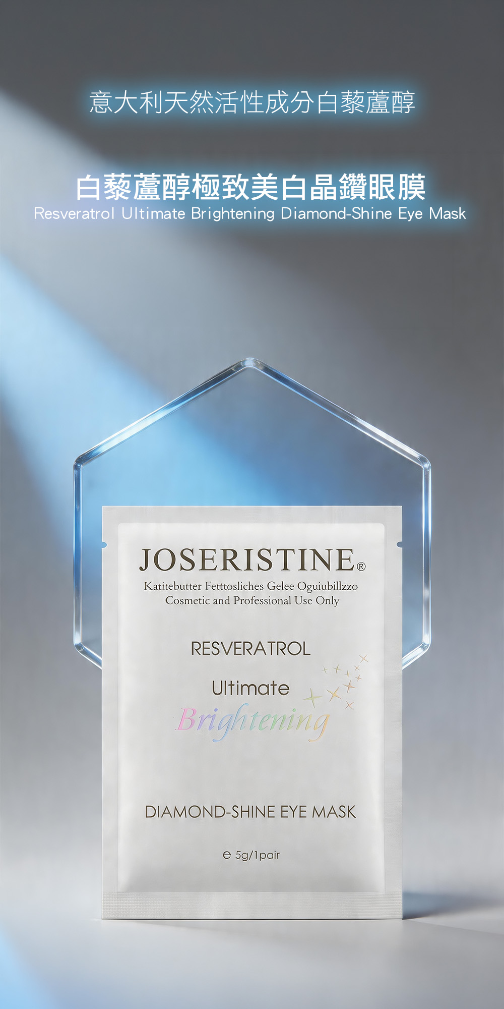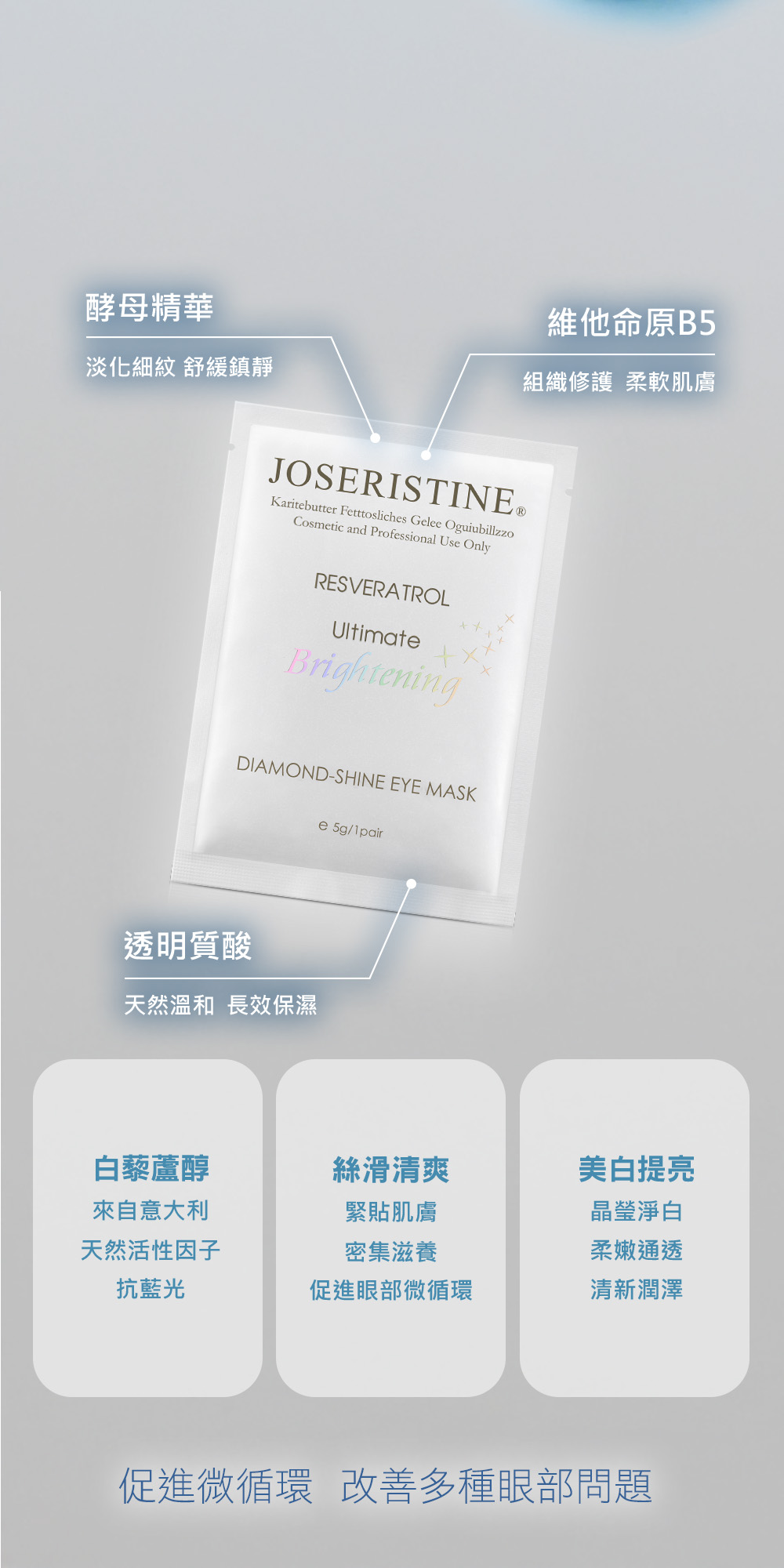 功效說明:全新升級配方;質感絲滑清爽,特別添加來自意大利天然植物美白活性因子-白藜蘆醇,配合抗藍光因子blumilight,採用腰果型眼膜設計,能緊貼於眼肚位置,密集滋養肌膚,抵抗電子產品釋放的藍光對肌膚細胞的侵害,促進眼部肌底循環,有效改善細紋、暗沉、鬆弛、浮腫等眼部肌膚問題,全方位修護眼部肌膚,令雙眸回復亮白神采。