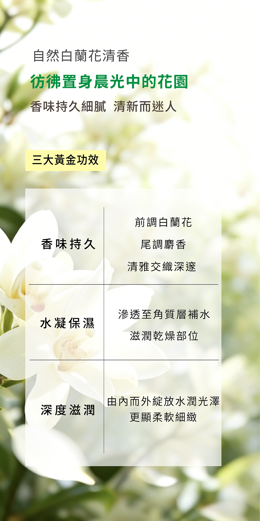 白蘭花麝香沐浴露泡沫細緻綿密,溫和不刺激。蘊含天然蔗糖、4重透明質酸、有機蘆薈精華等成分,能有效深度滋潤鎖水及潔淨肌膚。讓肌膚由內而外綻放水潤光澤,更顯柔軟細緻。用後散發自然白蘭花清香,彷彿置身晨光中的花園,清新而迷人。