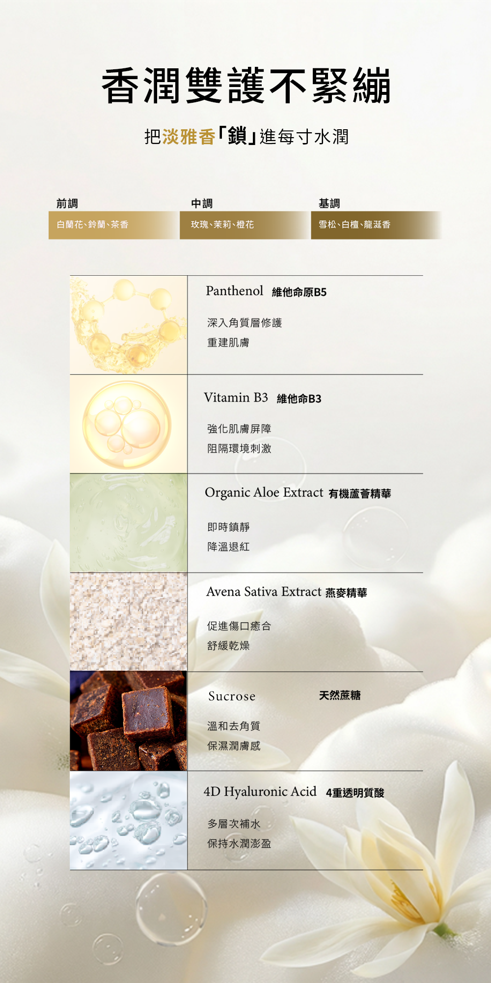 4重透明質酸、維他命B3、維他命原B5、有機蘆薈精華、燕麥精華