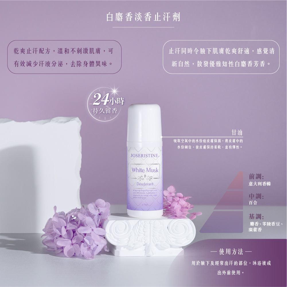 乾爽止汗走珠香氛,溫和不刺激肌膚,止汗同時令腋下肌膚乾爽舒適,感覺清新自然,散發優雅清新的白麝香芳香。