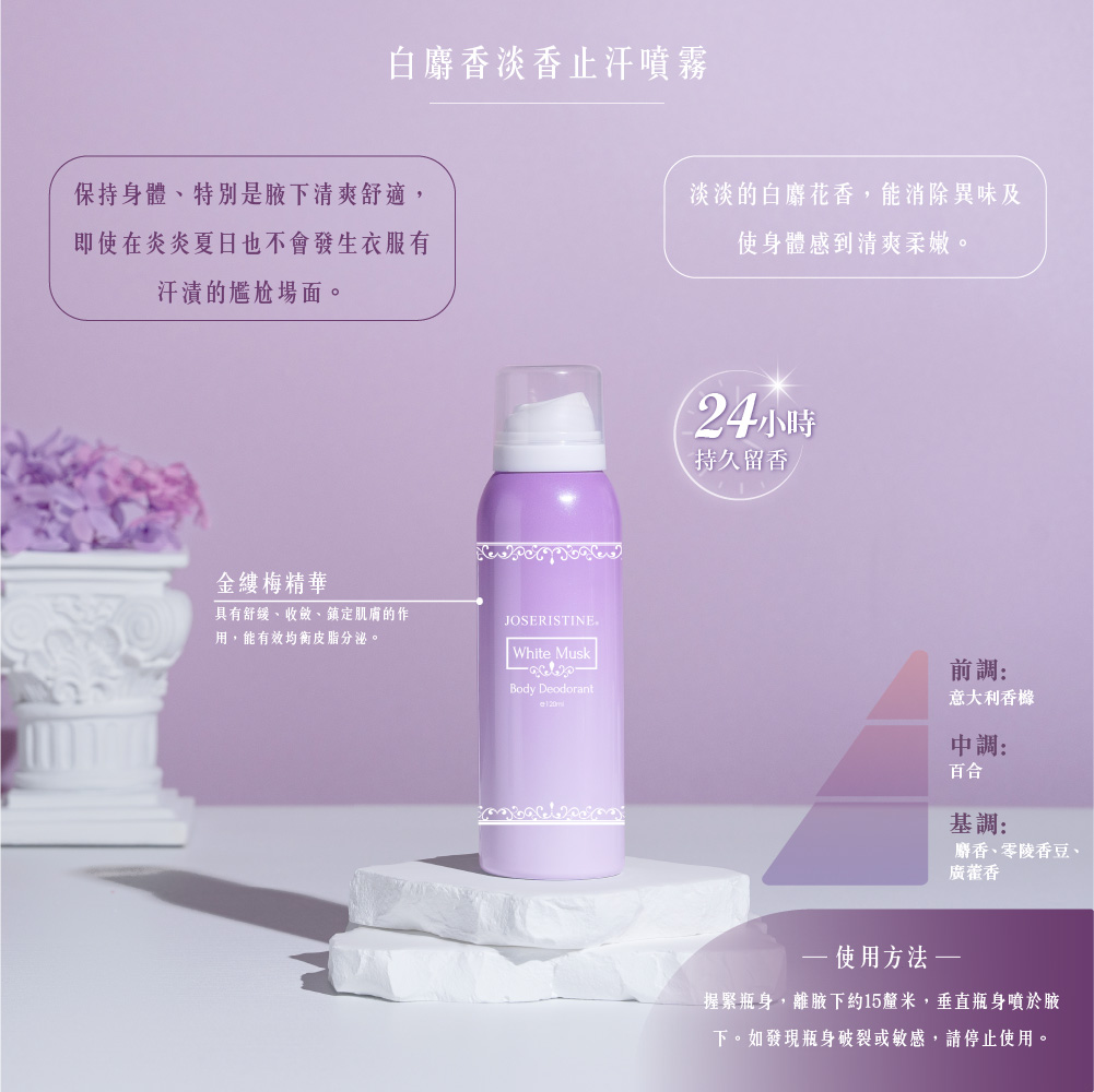 白麝香淡香止汗噴霧保持身體、特別是腋下清爽舒適,即使在炎炎夏日也不會發生衣服有汗漬的尷尬場面。淡淡的白麝花香,能消除異味及使身體感到清爽柔嫩。