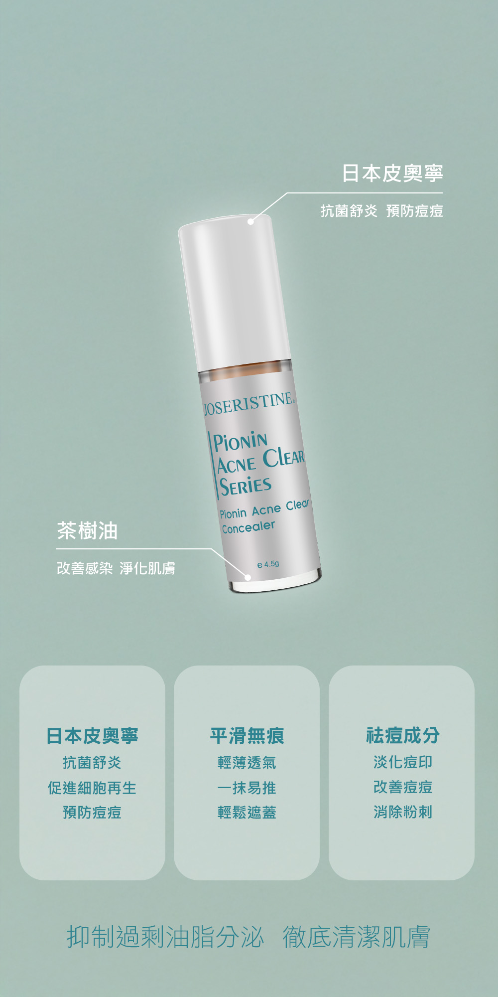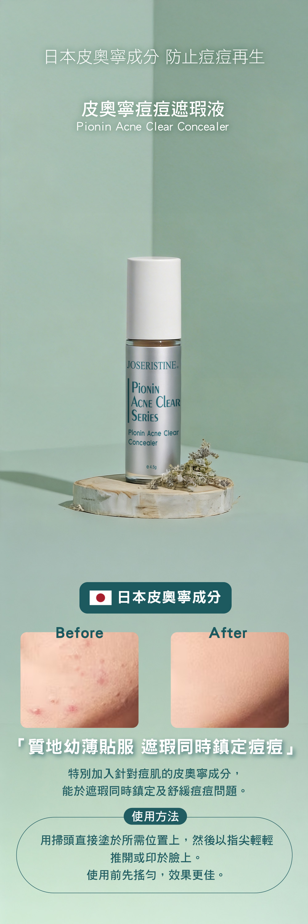皮奧寧痘痘遮瑕液質地幼薄貼服,薄薄一層高密度地遮蓋皮膚表層,有效遮蓋痘痘、斑痕、細紋及瑕疵,塑造無瑕完美妝容。特別加入針對痘肌的皮奧寧成分,能於遮瑕同時鎮定及舒緩痘痘問題。