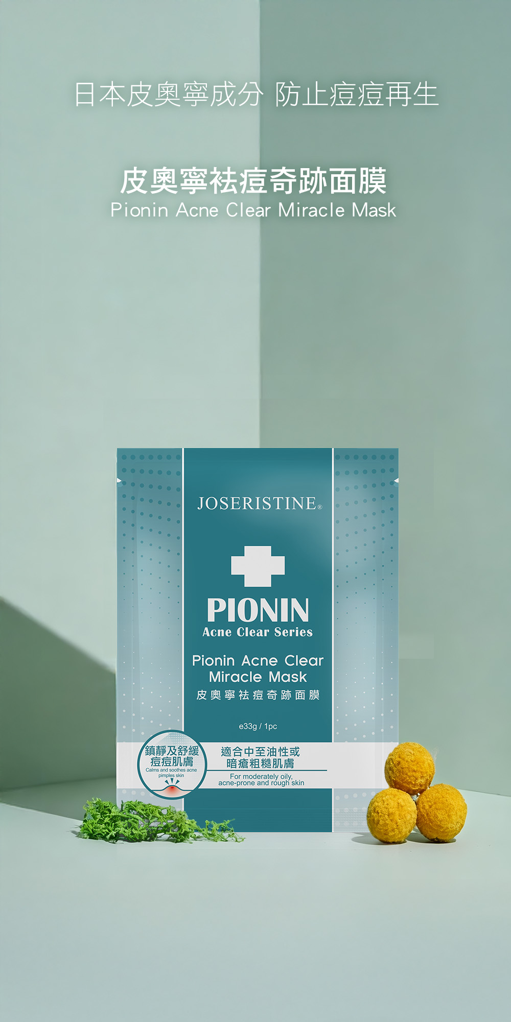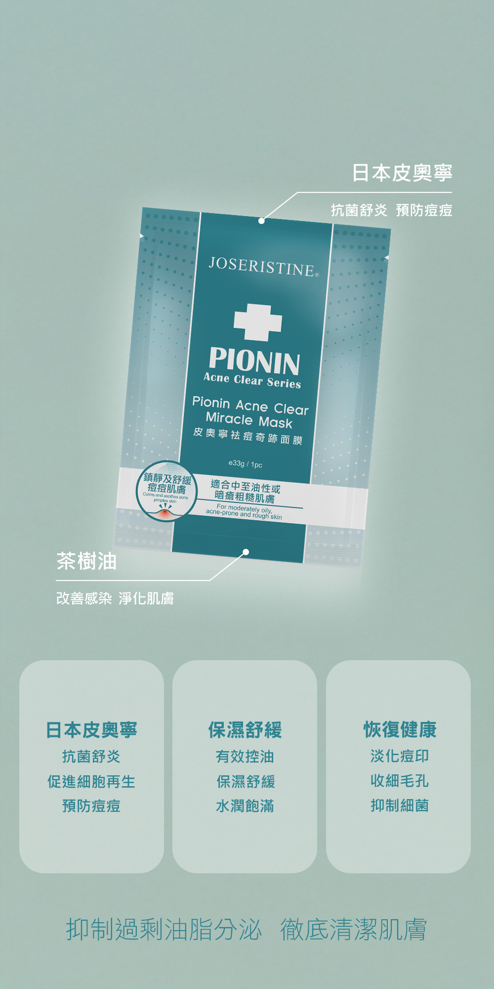 升級絲質網托,精華更吸收、面膜更貼面! 蘊含來自日本針對痘痘的皮奧寧成分,具有強效抗菌作用,有效鎮靜及舒緩痘痘肌膚、減退發紅現象。配合茶樹油、維他命原B5多種修復成分,有助平衡肌膚的油脂分泌,收細毛孔,淡化痘印,重煥細嫩平滑肌膚。