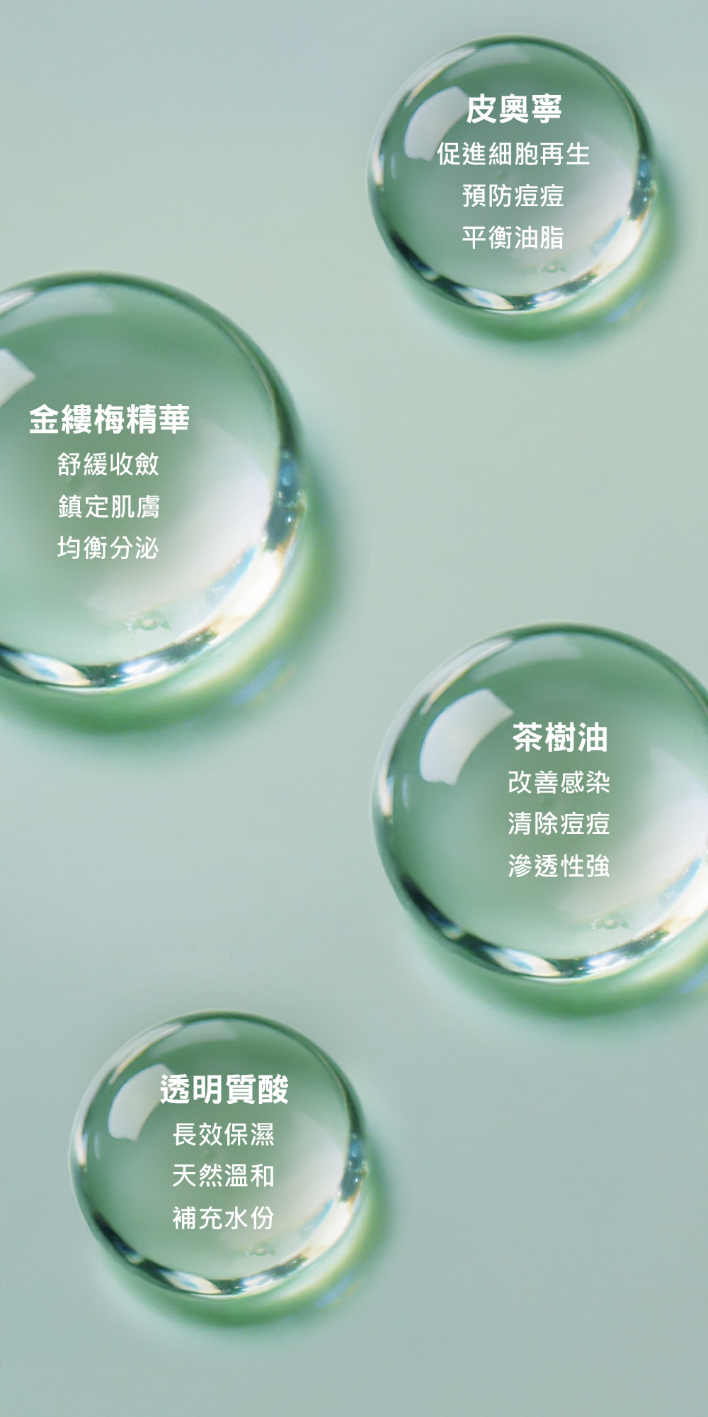 皮奧寧、茶樹油、金縷梅精華、透明質酸、維他命原B5