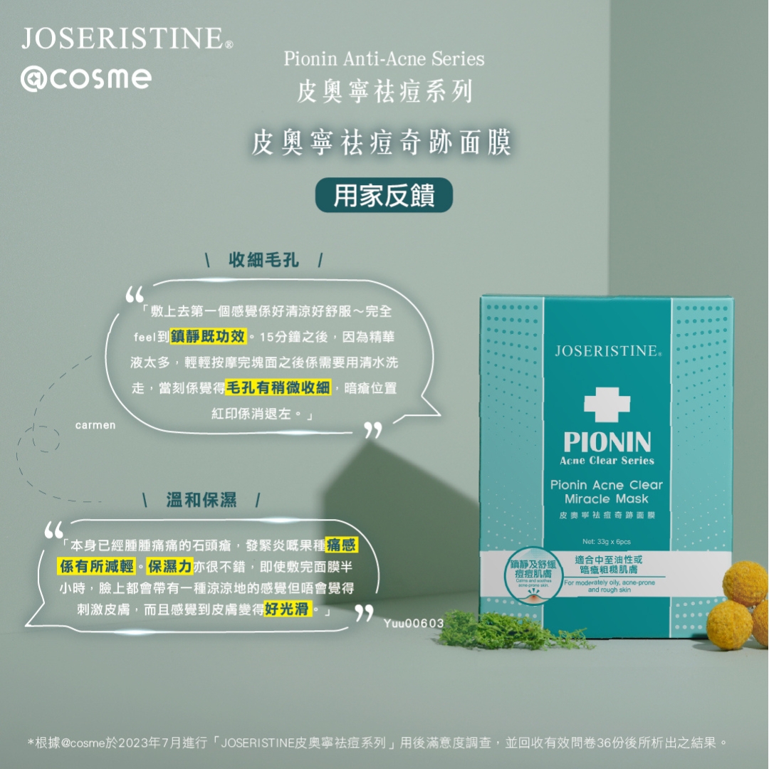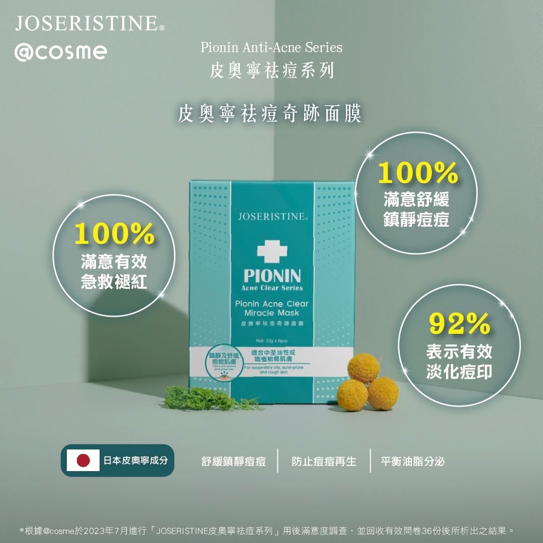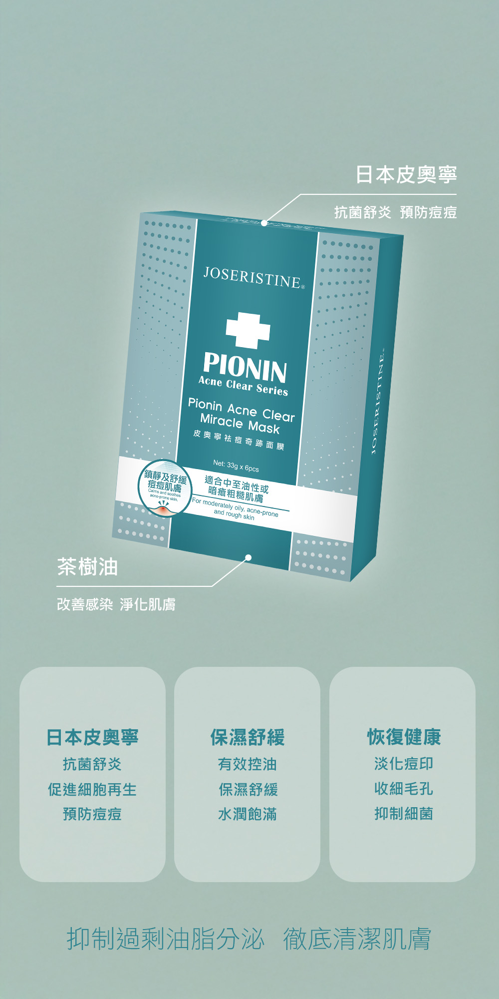 升級絲質網托,精華更吸收、面膜更貼面! 蘊含來自日本針對痘痘的皮奧寧成分,具有強效抗菌作用,有效鎮靜及舒緩痘痘肌膚、減退發紅現象。配合茶樹油、維他命原B5多種修復成分,有助平衡肌膚的油脂分泌,收細毛孔,淡化痘印,重煥細嫩平滑肌膚。