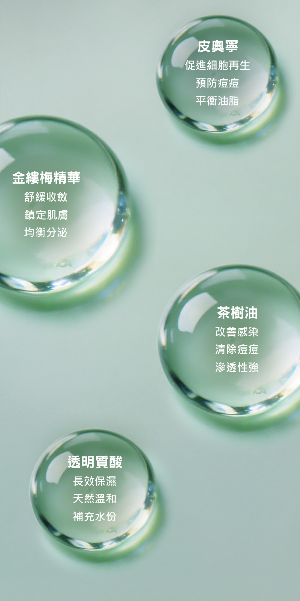 皮奧寧、茶樹油、金縷梅精華、透明質酸、維他命原B5