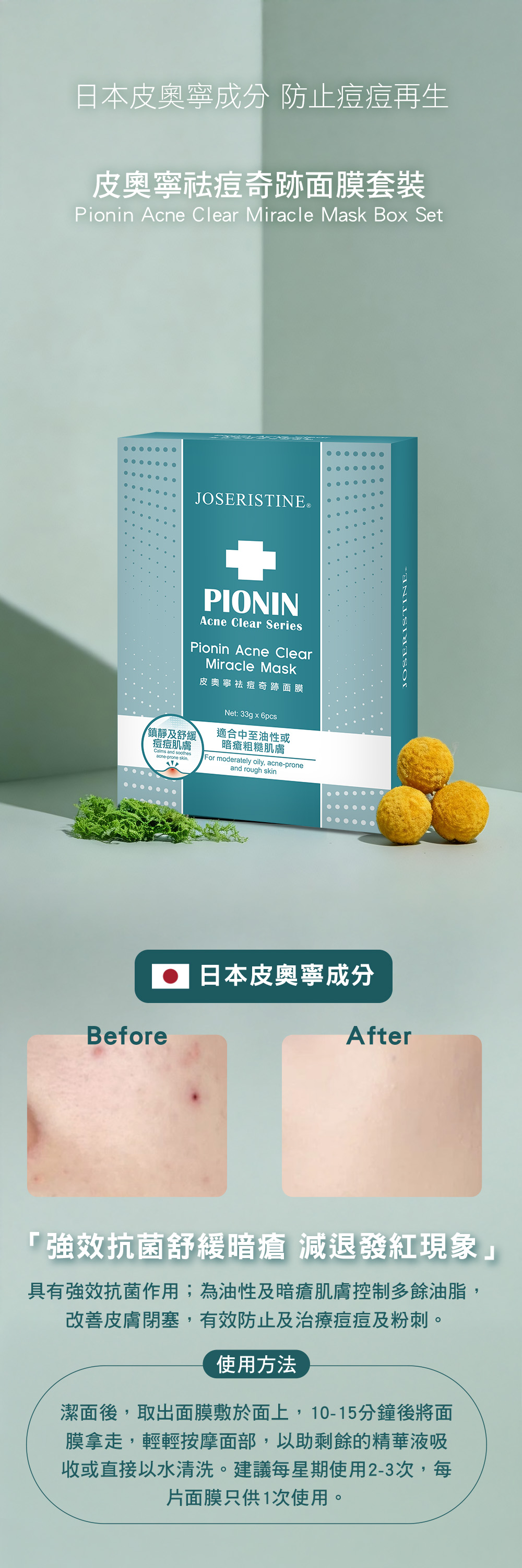 升級絲質網托,精華更吸收、面膜更貼面! 蘊含來自日本針對痘痘的皮奧寧成分,具有強效抗菌作用,有效鎮靜及舒緩痘痘肌膚、減退發紅現象。配合茶樹油、維他命原B5多種修復成分,有助平衡肌膚的油脂分泌,收細毛孔,淡化痘印,重煥細嫩平滑肌膚。