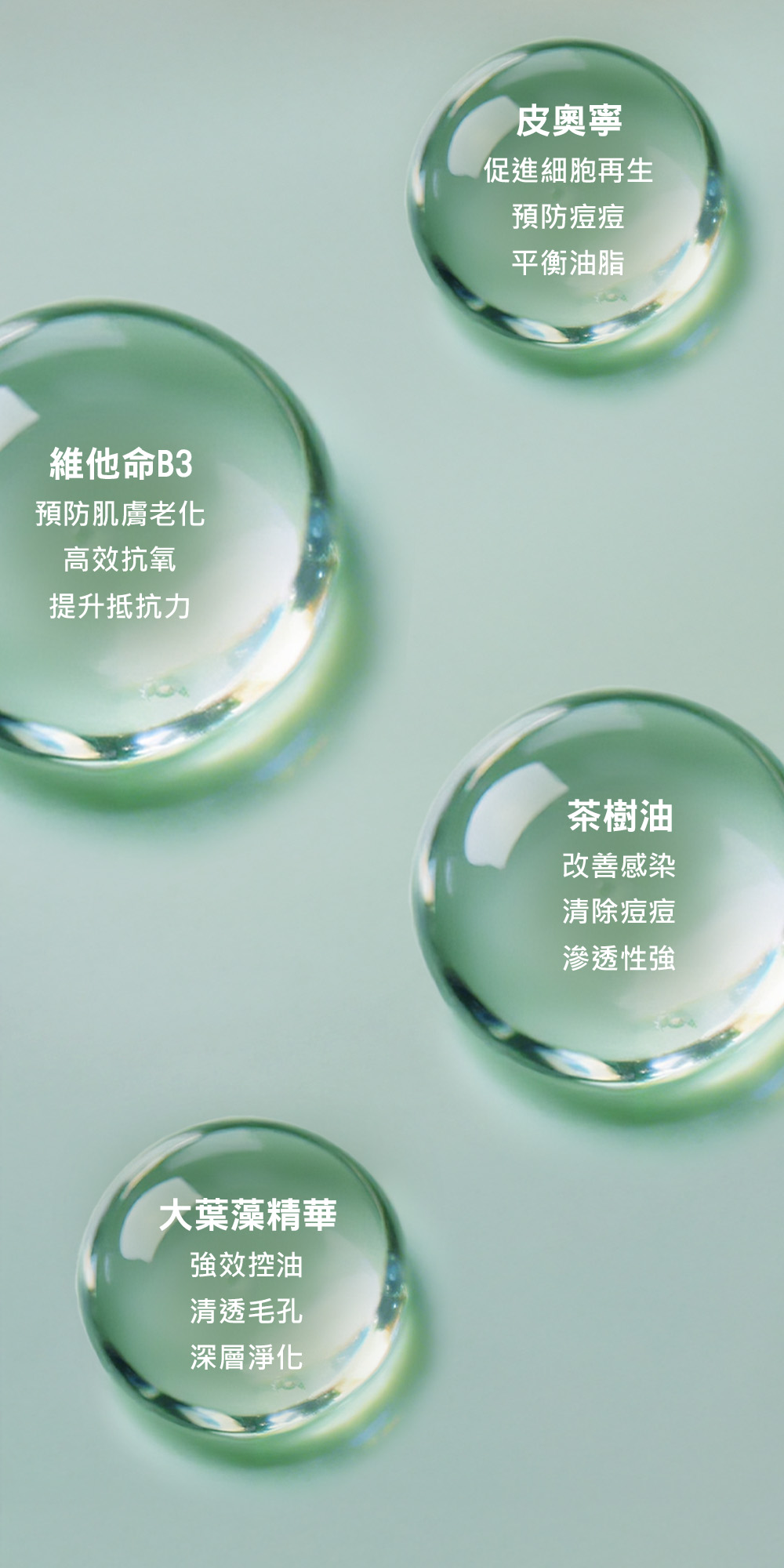 皮奧寧、積雪草精華、茶樹油、紅沒藥醇、維他命B3、益生元、透明質酸
