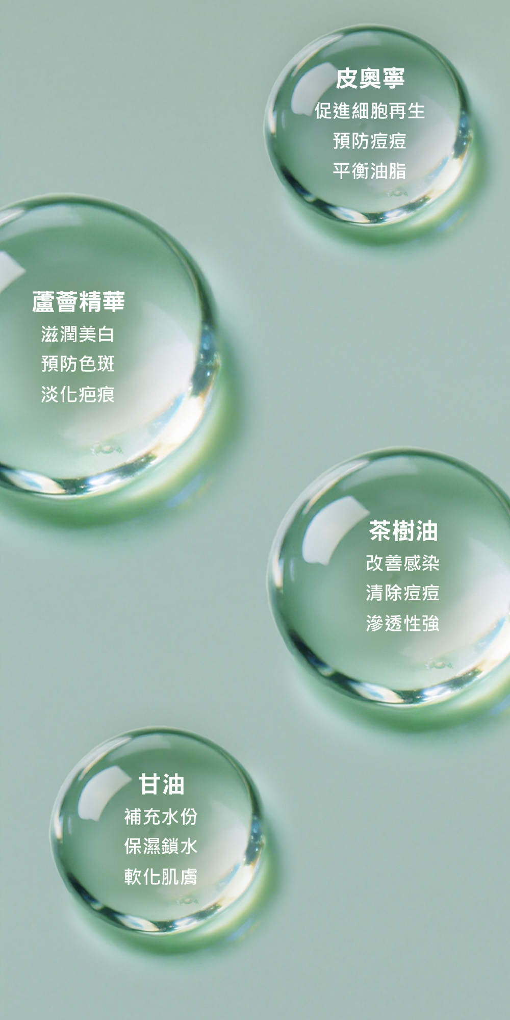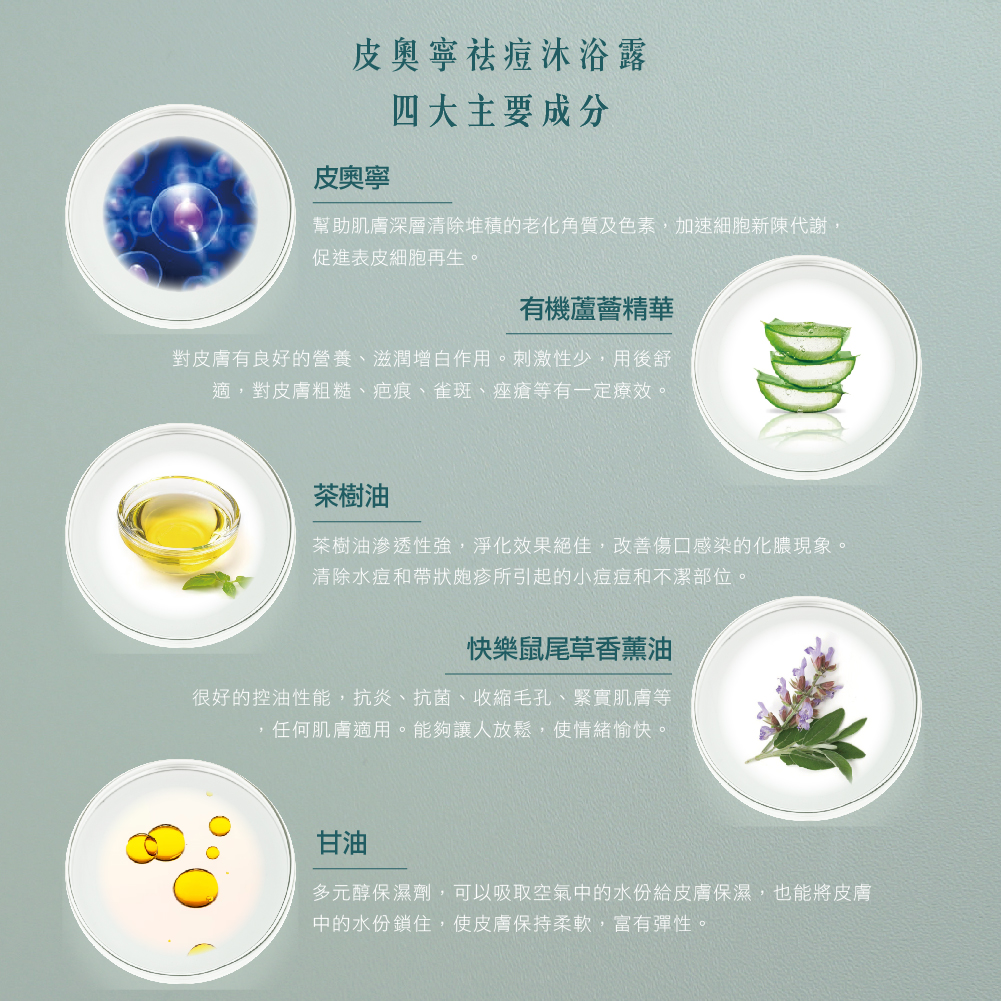 皮奧寧、茶樹油、快樂鼠尾草油、有機蘆薈精華、甘油