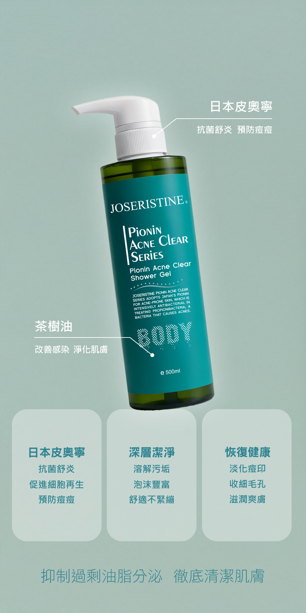 特別採用皮奧寧成分及多種天然植物精華,於潔膚時有效清除肌膚油脂及污垢,同時能預防及減少痘痘生長,舒緩痘痘引起的紅腫不適,淡化痘印改善膚色不均。同時加入了茶樹及快樂鼠尾草天然香薰精油,能有效平衡油脂分泌,淨化肌膚表面油光。
