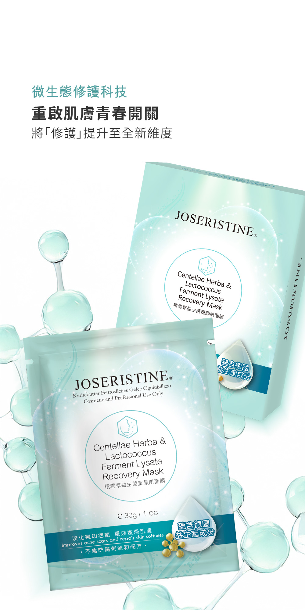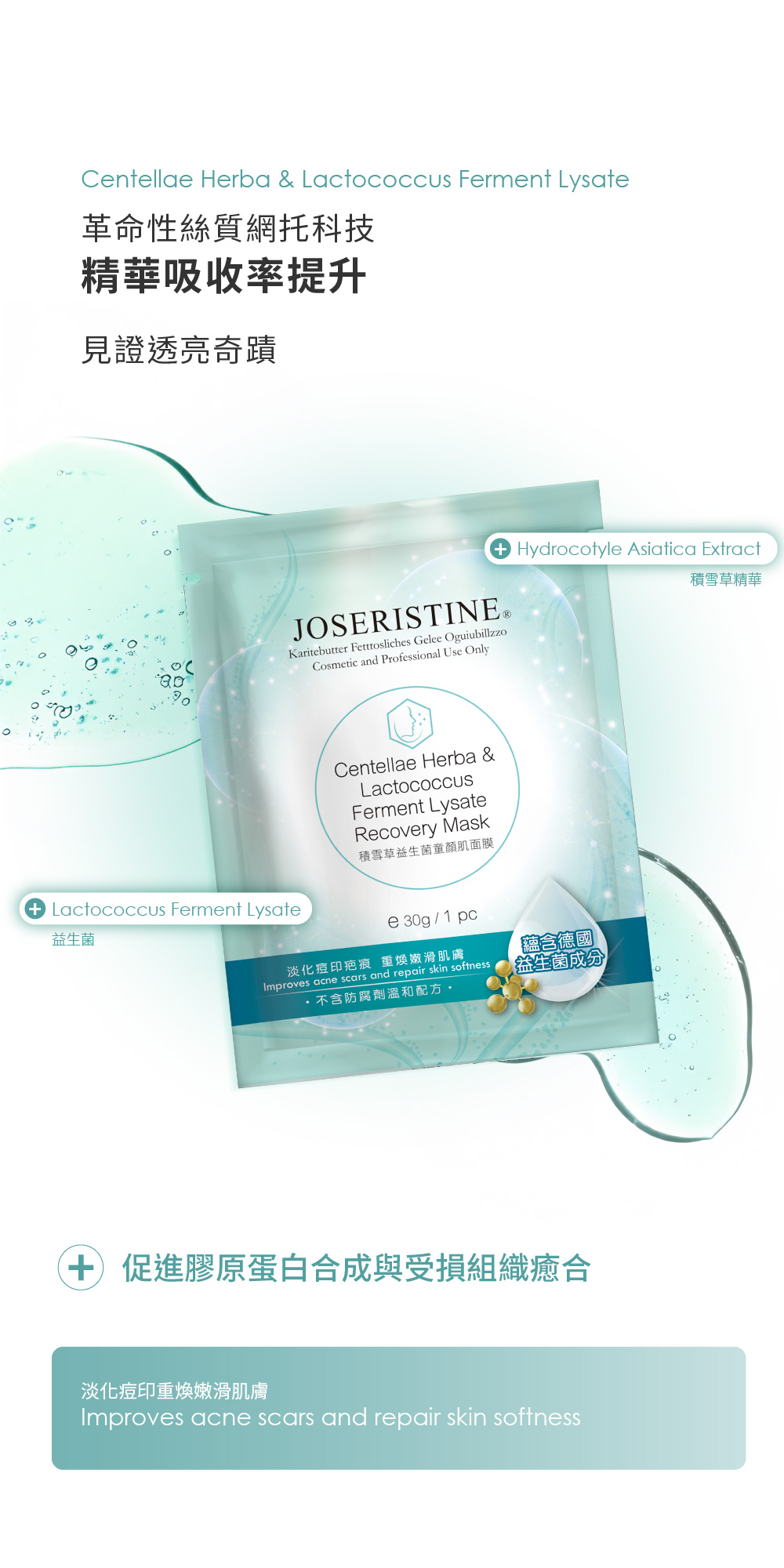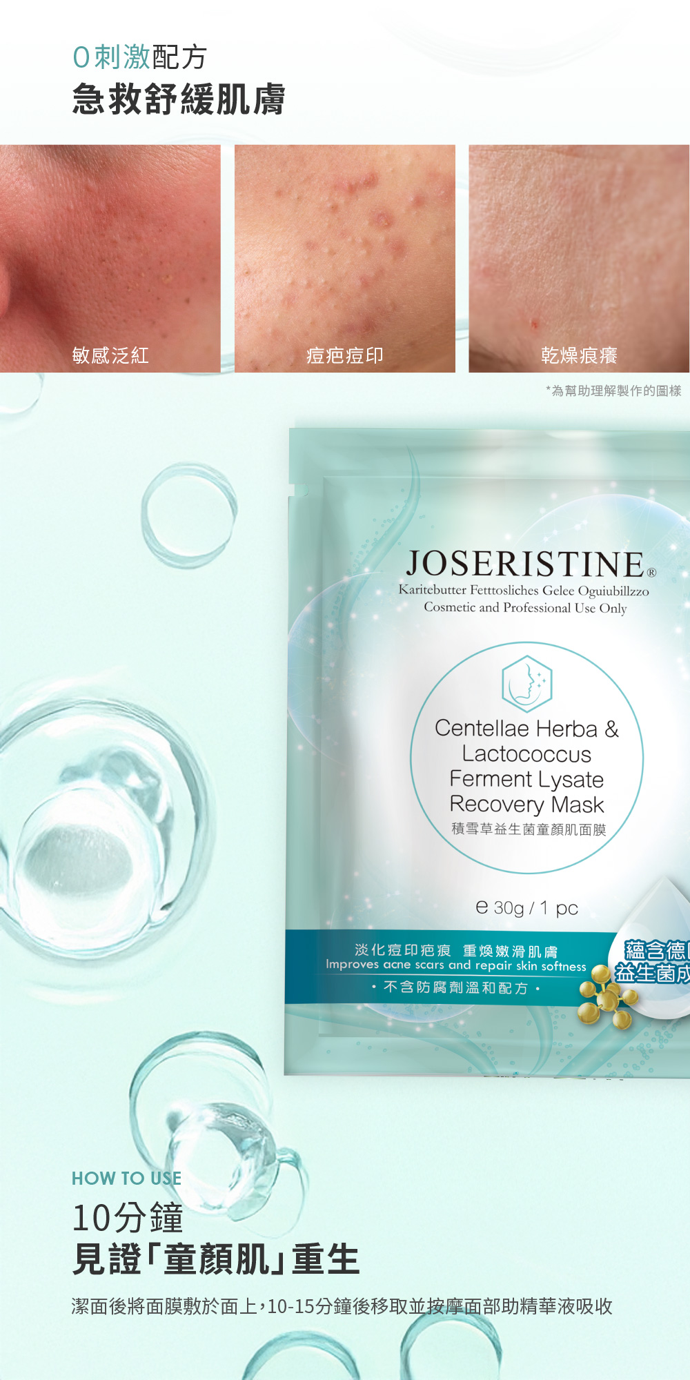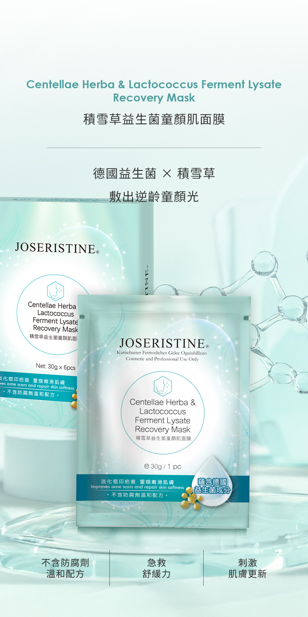 不澀眼溫和配方,不含防腐劑;蘊含舒緩修復成分-積雪草精華,配合來自德國的益生菌及多種修護成分,有效促進膠原蛋白合成,激活肌膚自我更新潛能,促進受損組織癒合,強化肌膚屏障,淡化痘印、疤痕,重煥緊緻嫩滑肌膚。