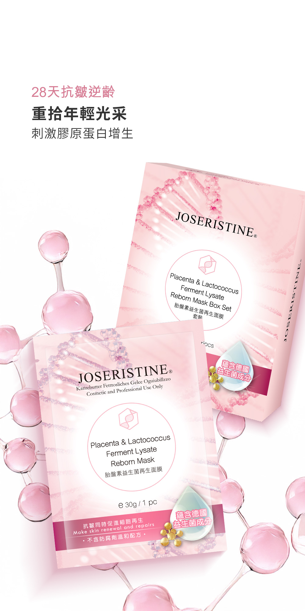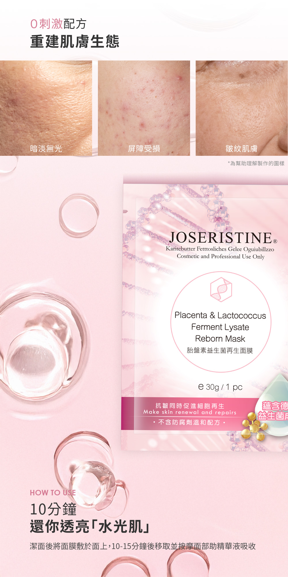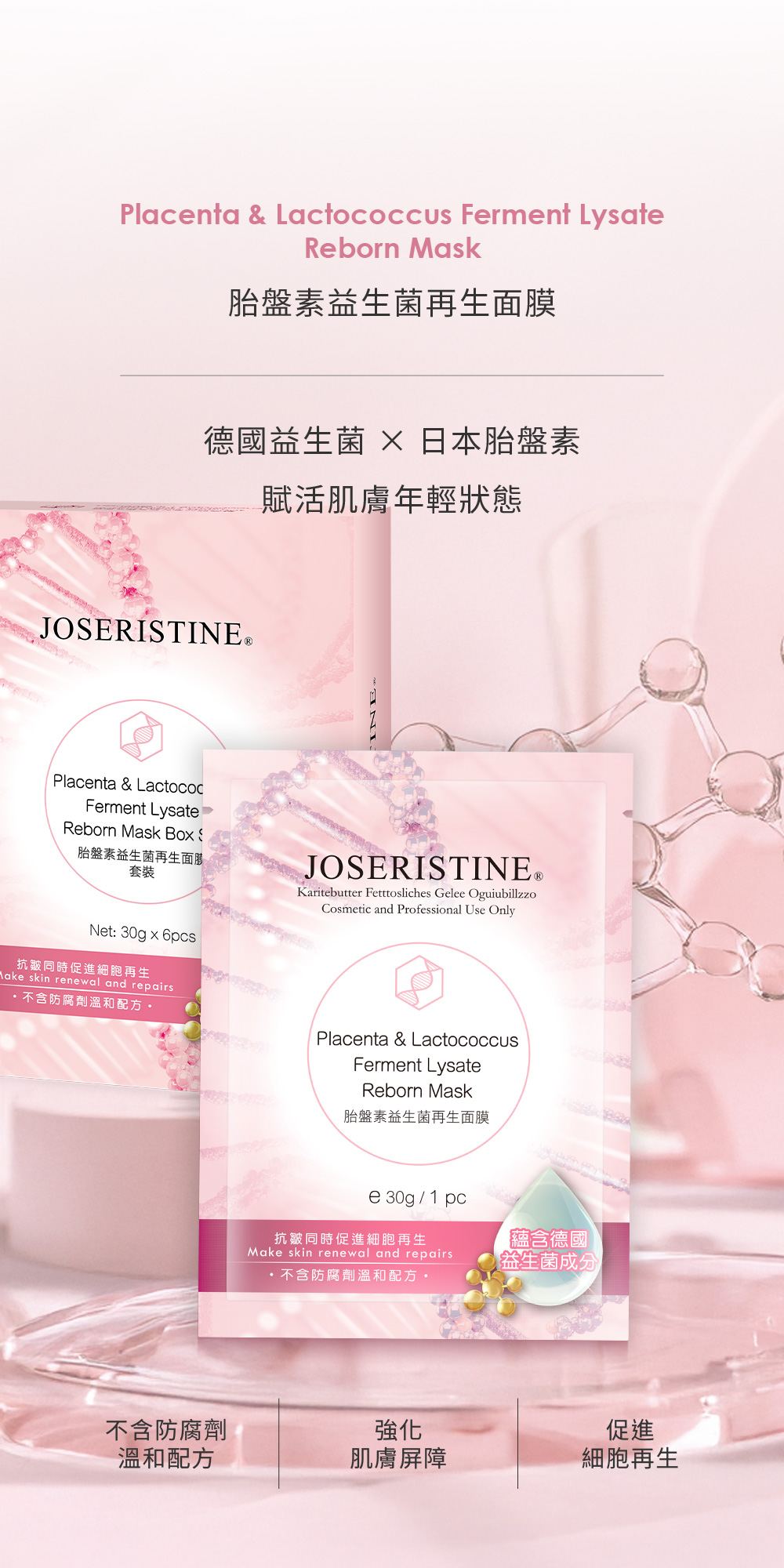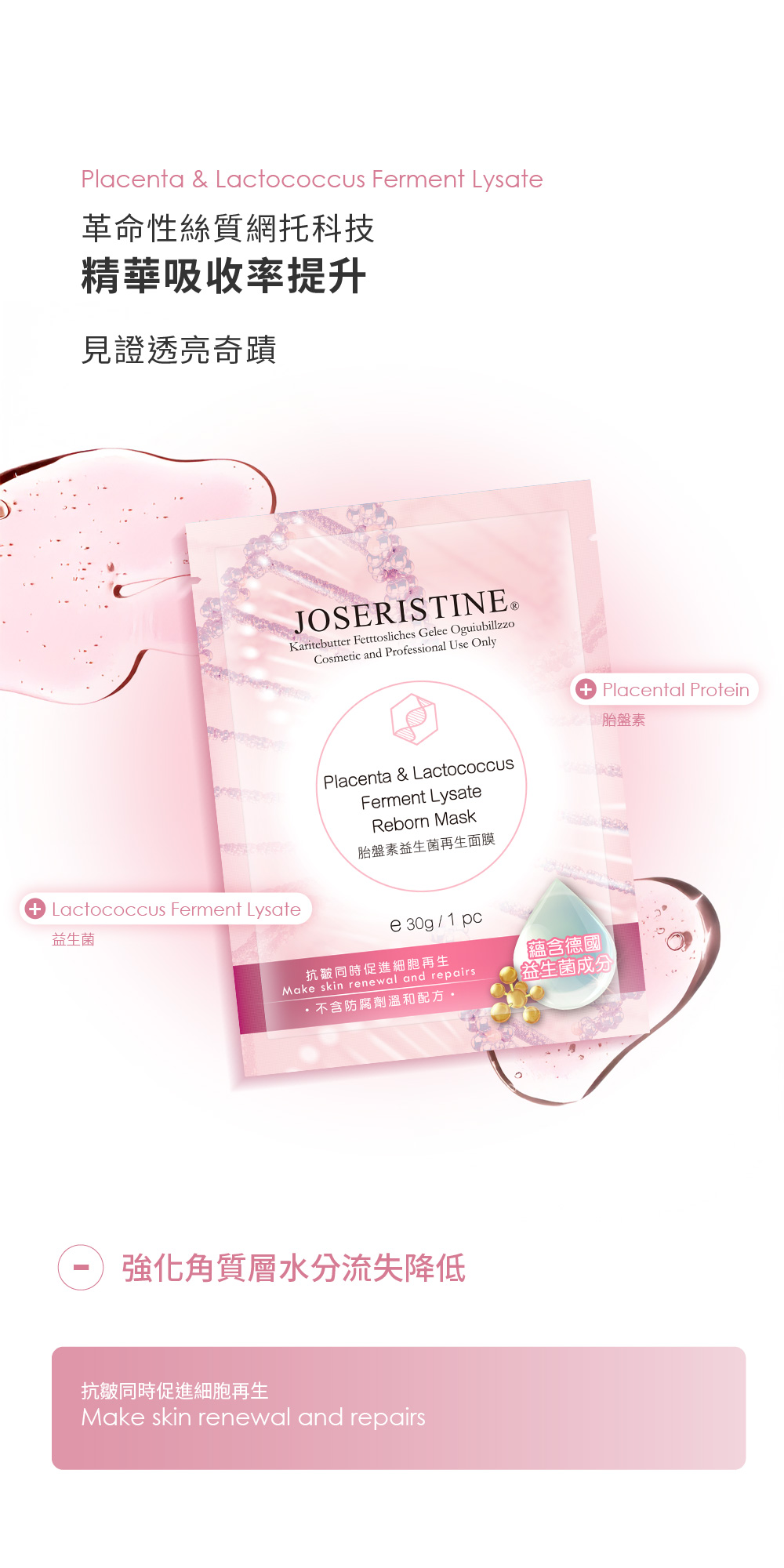 升級絲質網托,精華更吸收、面膜更貼面! 不澀眼溫和配方,不含防腐劑;蘊含珍貴活膚成分-日本胎盤素,配合來自德國的益生菌及多種修護成分,聚集眾多肌膚生長所需要的營養,抗皺美白同時促進細胞再生,強化肌膚屏障,修復受損組織,調理膚質,讓肌膚重拾年輕光采。