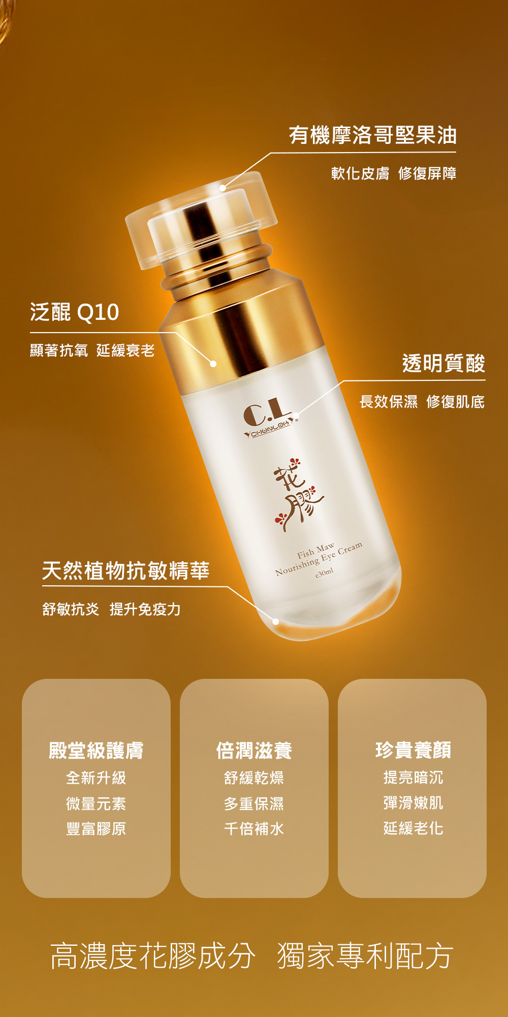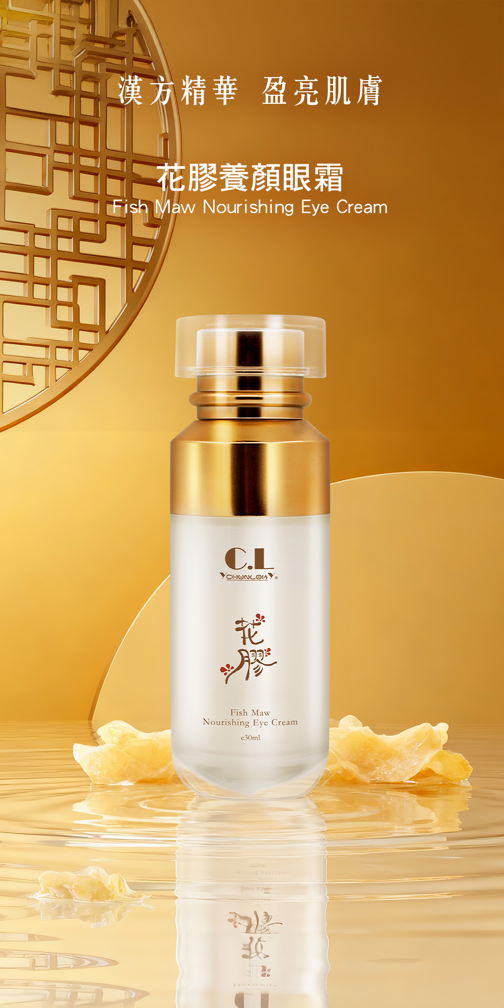 花膠養顏眼霜,獨特配方配合嶄新技術,傳統東方概念及滋補養顏配方,蘊含殿堂級滋養成分-花膠精華,為眼部周圍的肌膚補充豐富的膠原蛋白。 眼霜並配以法國註冊專利成分EyelissTM以及有機摩洛哥純堅果油,能有效收緊眼部周圍的肌膚,撫平眼部細紋及魚尾紋,淡化眼袋並解決眼部浮腫等問題,使雙眼看起來更加明亮動人。