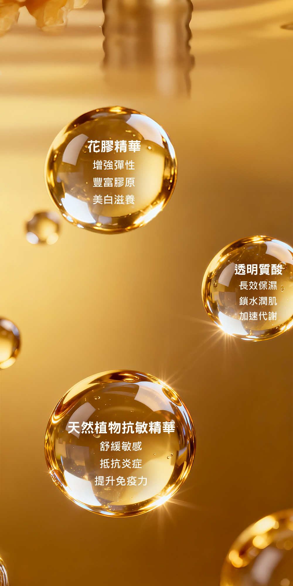 花膠精華、微膠原肽、天然植物抗敏精華(積雪草精華、虎杖根精華、黃芩根精華、茶葉精華、光果甘草根精華、母菊花精華、迷迭香精華)、有機蘆薈精華、透明質酸