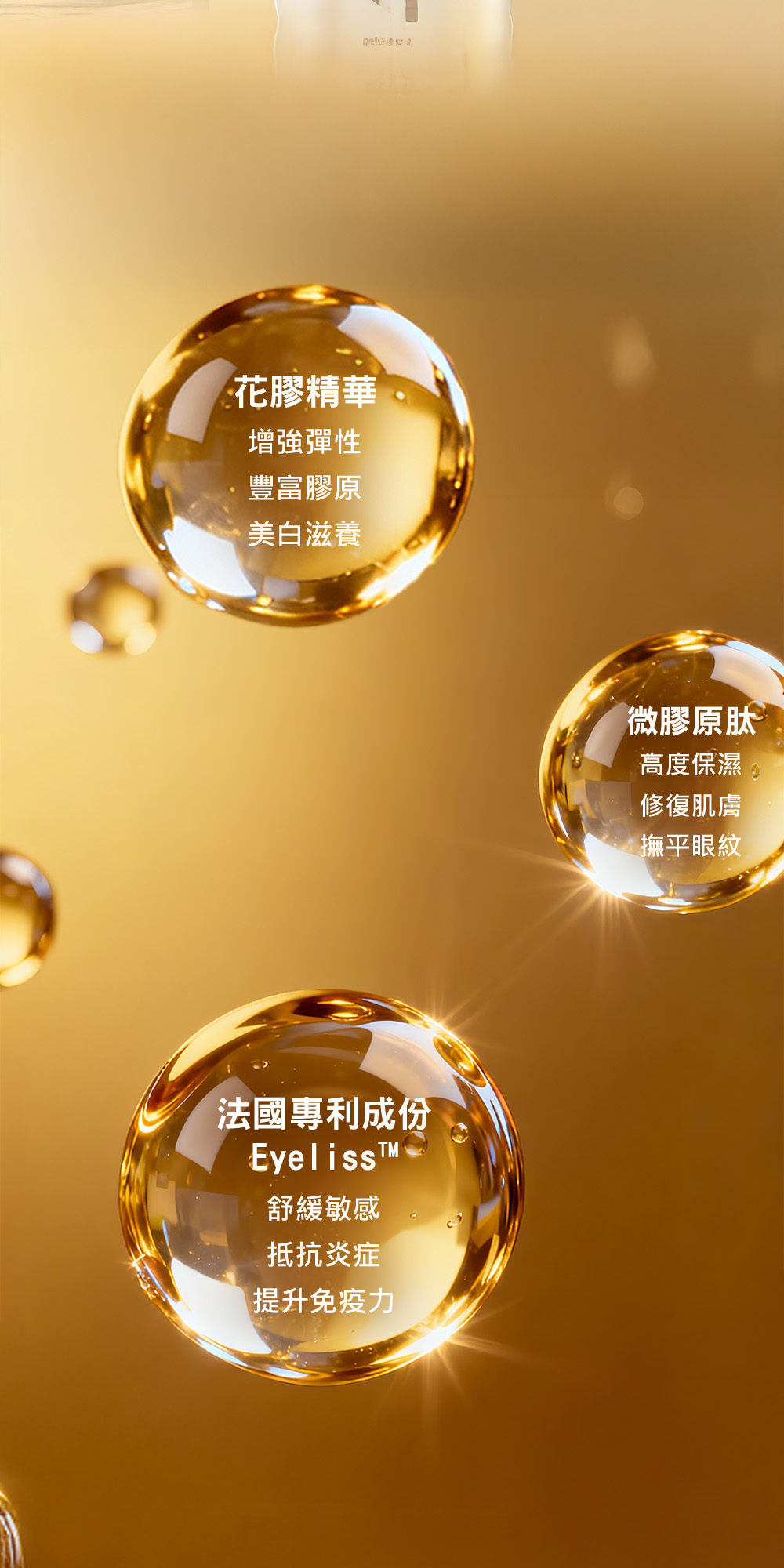 花膠精華、微膠原肽、法國註冊專利成分─EyelissTM(二肽-2、棕櫚醯四肽-7)、有機摩洛哥純堅果油、天然植物抗敏精華(積雪草精華、虎杖根精華、黃芩根精華、茶葉精華、光果甘草根精華、母菊花精華、迷迭香精華)、Q10、透明質酸