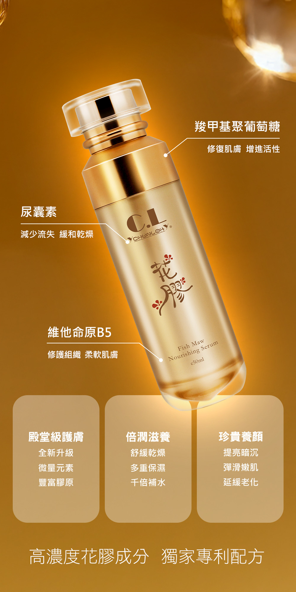 花膠養顏精華,獨特配方配合嶄新技術,傳統東方概念及滋補養顏配方-花膠精華,將微細養分滲透肌膚細胞,使肌膚回覆緊緻彈性。