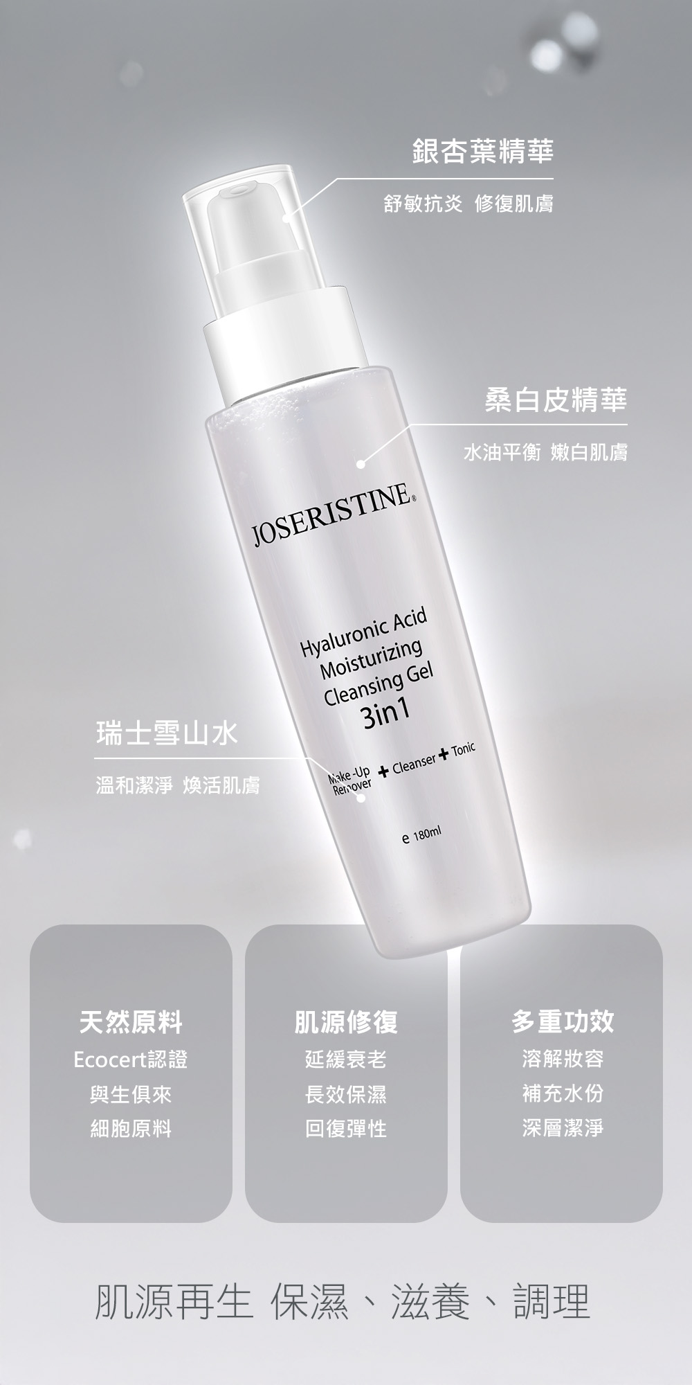 集卸妝、潔面及爽膚為一體,能有效卸除彩妝等污物,清潔面部多餘油脂,淨化毛孔;蘊含Ecocert認證的天然透明質酸及多種保濕修護成分,潔膚同時保濕嫩膚,幫助改善肌膚乾燥缺水現象,收緊粗大毛孔,肌膚倍感水嫩細滑。