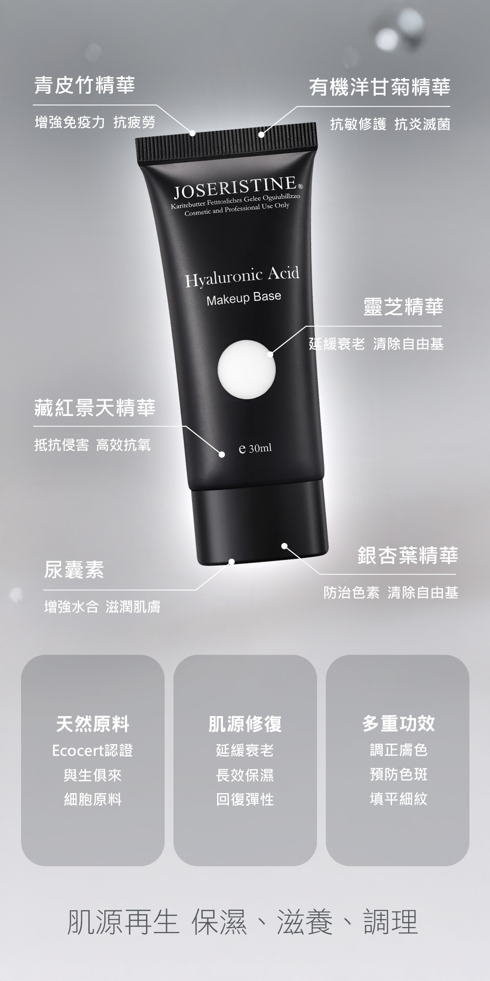 透明質酸、藏紅景天精華、有機洋甘菊精華、銀杏葉精華、靈芝精華、尿囊素