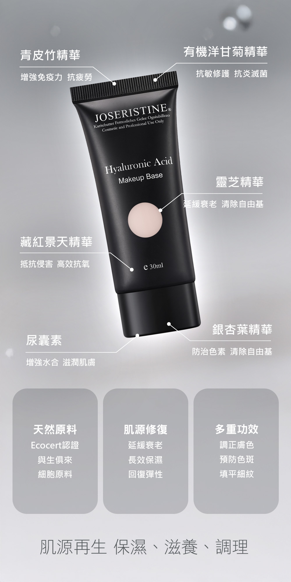 透明質酸、藏紅景天精華、有機洋甘菊精華、青皮竹精華、銀杏葉精華、靈芝精華、尿囊素