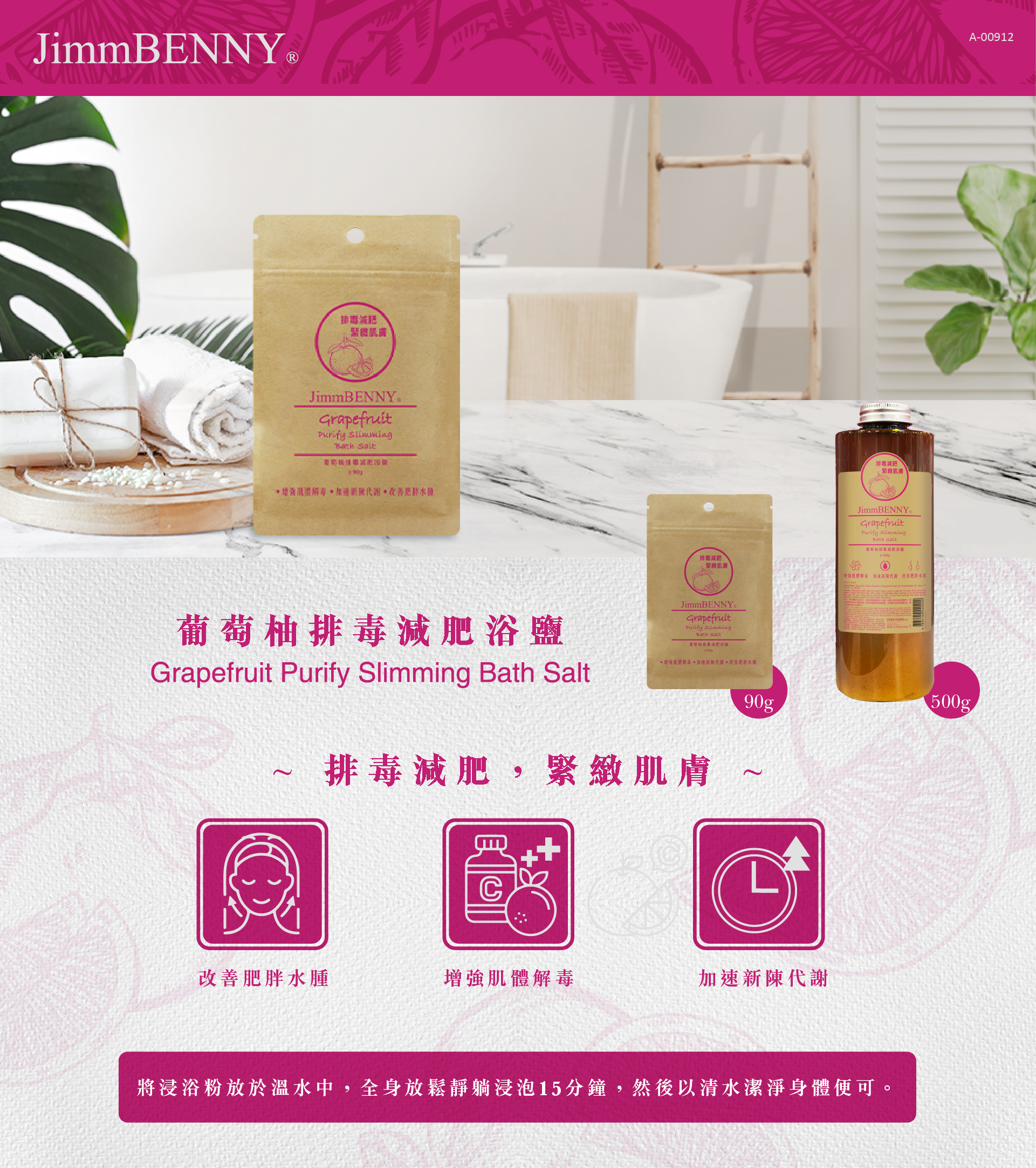 足浴:用4-5L溫水,加入一包90G 浴鹽/浴粉,份量可隨個人喜好增加。