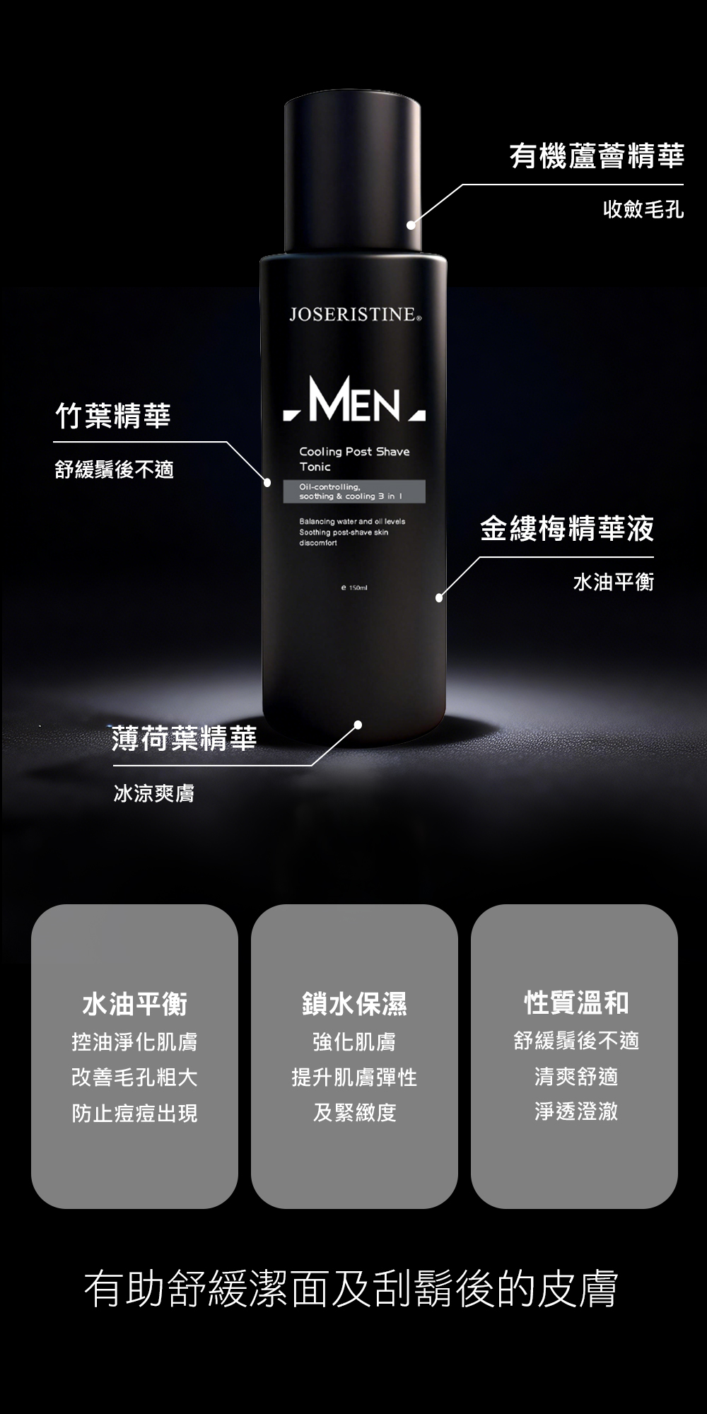 集爽膚水和鬚後水的功能於一身。具控油功效,令肌膚達致水油平衡,防止痘痘出現。蘊含蘆薈和薄荷精華,有助舒緩剃鬚後皮膚的不適,並帶來冰涼暢快感覺。